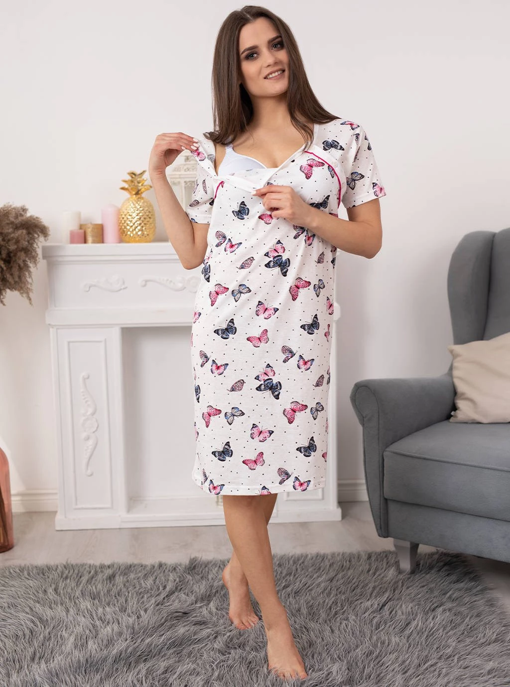 Ein weißes Umstandsshirt mit zarten blauen und rosafarbenen Schmetterlingen, die mit weißen Paspeln verziert sind, und einem einfachen Verschluss zum Stillen auf beiden Seiten der Brust. Das weiße Hemd ist eine attraktive und romantische Lösung für Frauen, die bunte Drucke lieben.