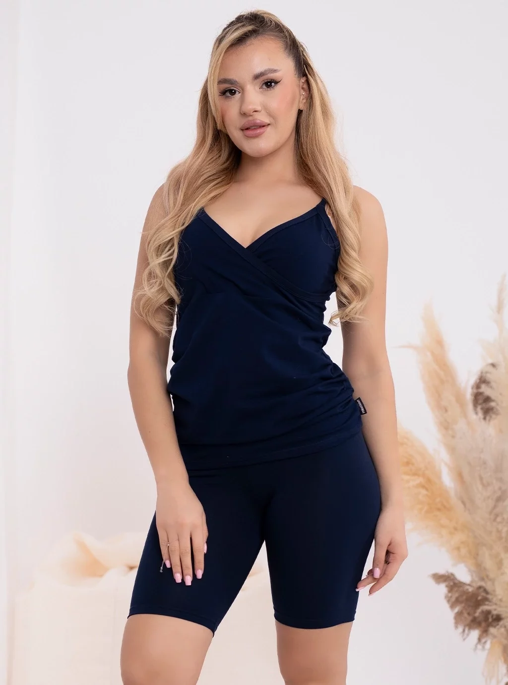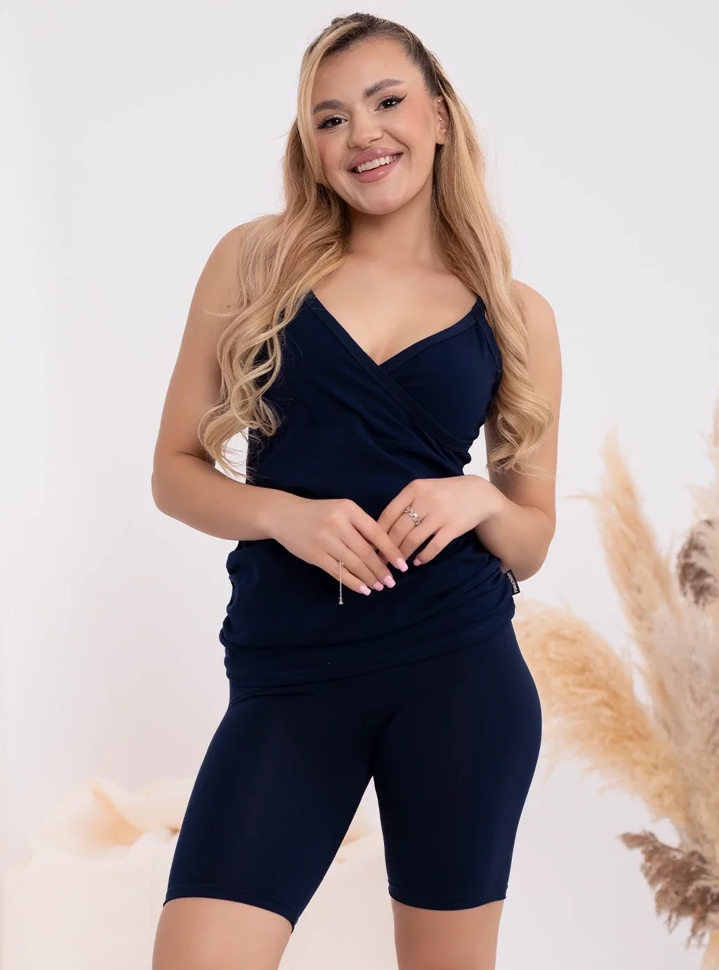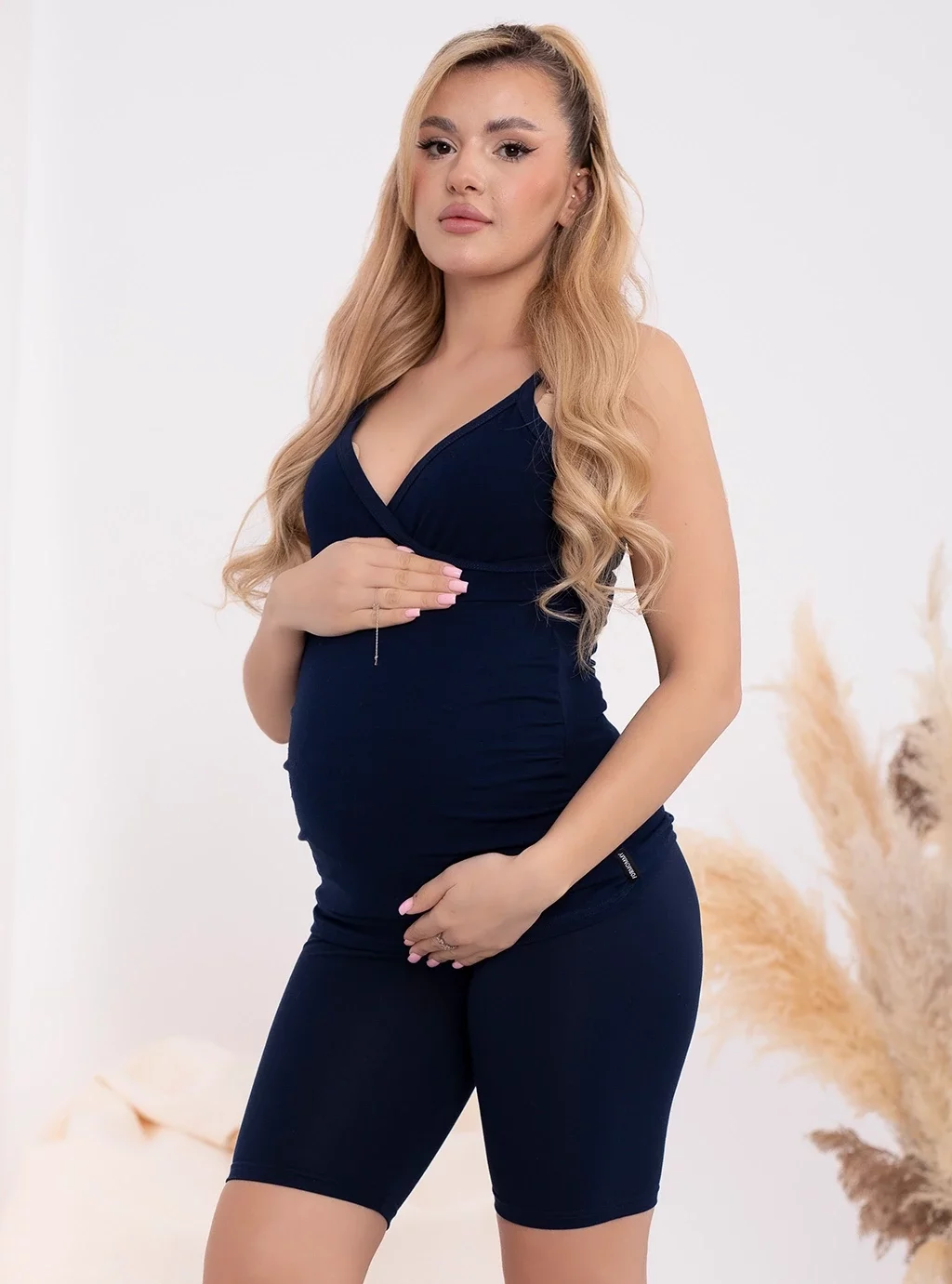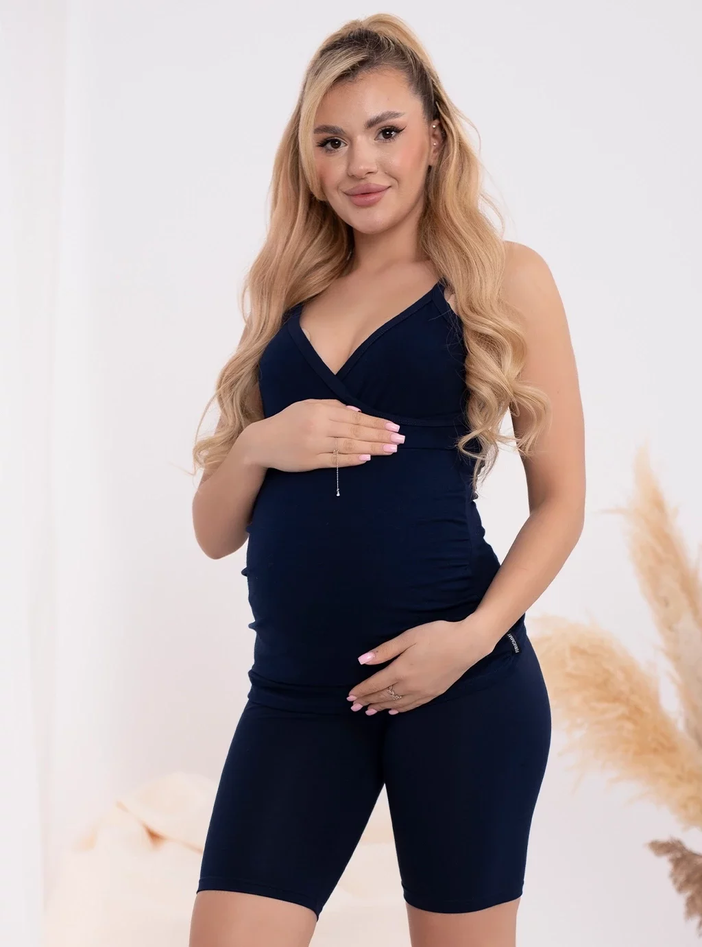 Modische marineblaue Radlerhosen werden in Polen aus 95 % Baumwolle und 5 % Elasthan hergestellt. Wir empfehlen schwangeren Frauen Luna- oder Emma -Blusen in der gleichen Farbe.