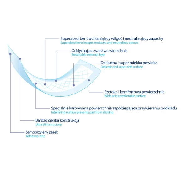 • Superabsorbierend, um die Feuchtigkeit im Inneren der Einlage zu halten und unangenehme Gerüche zu neutralisieren