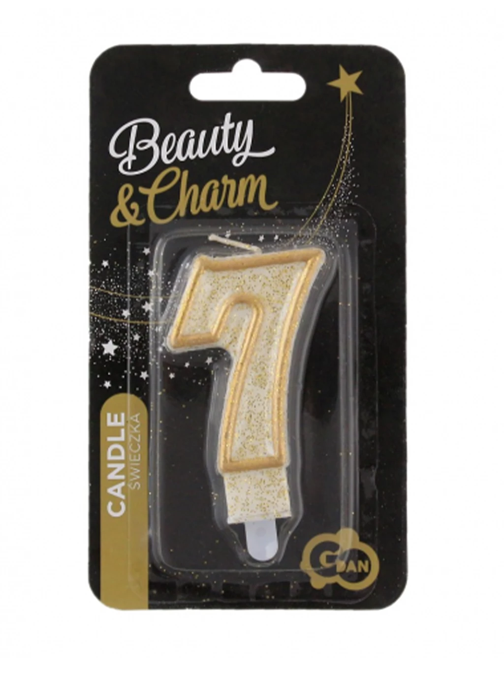 Świeczka urodzinowa cyferka "7" w kolorze Gold glitter- złoty brokatowy kontur.