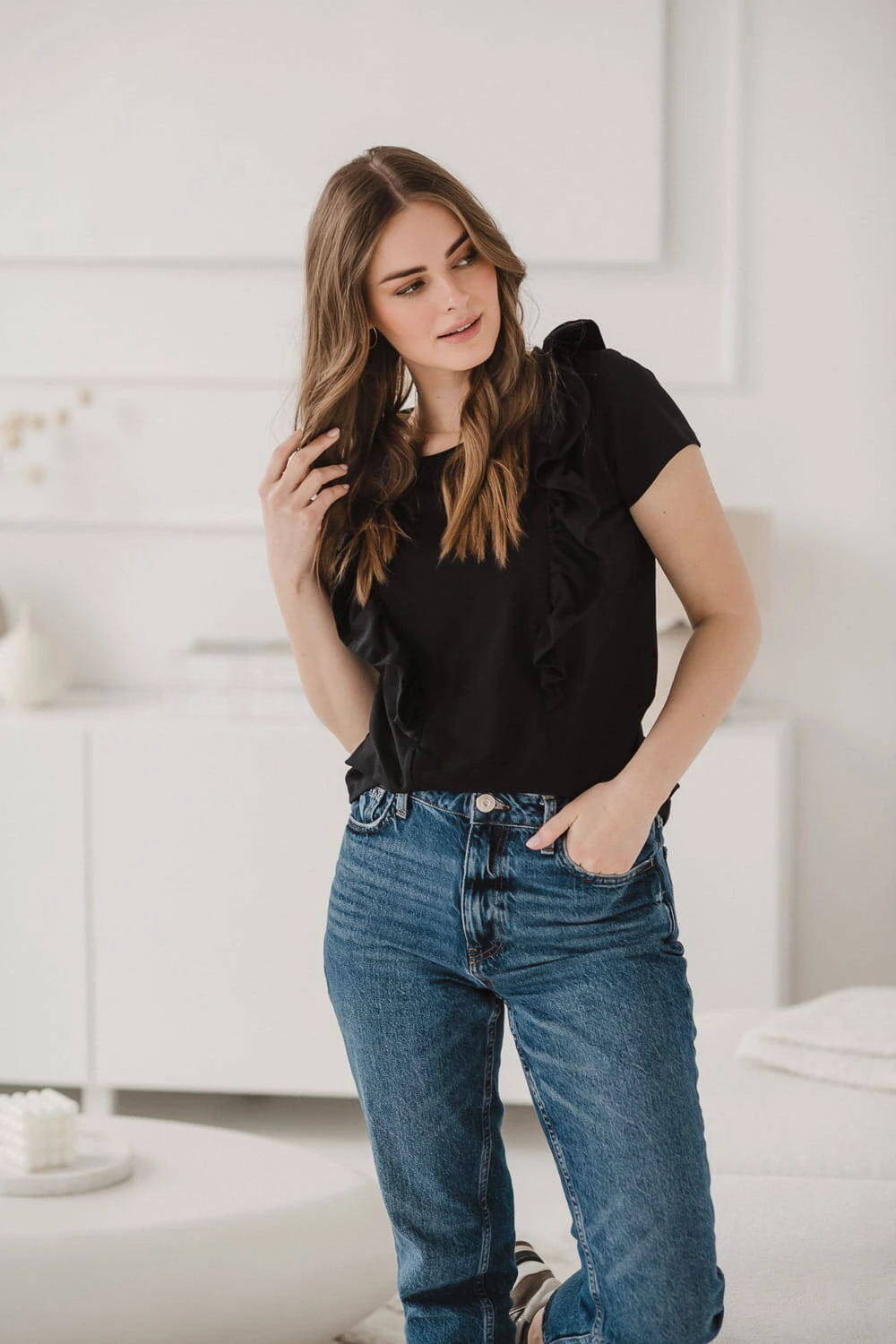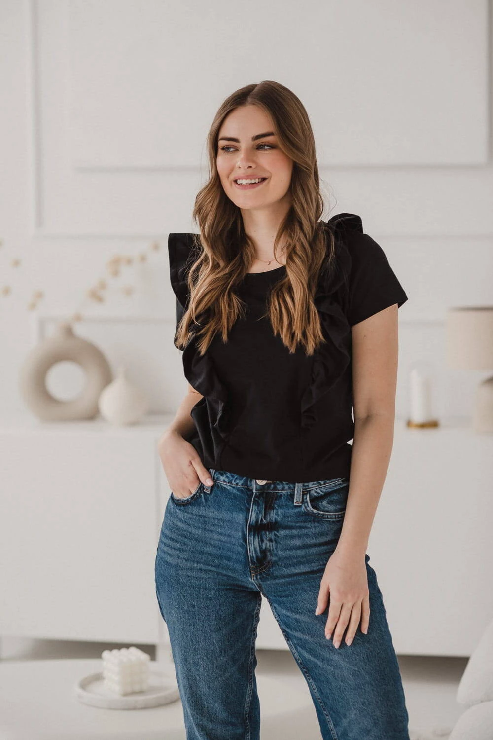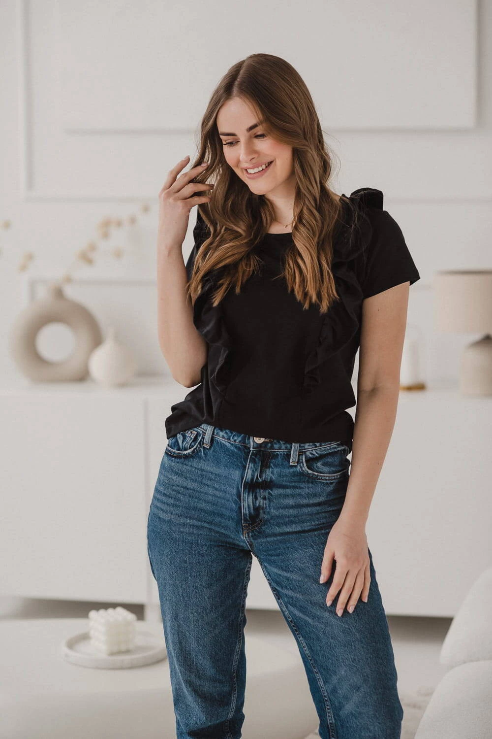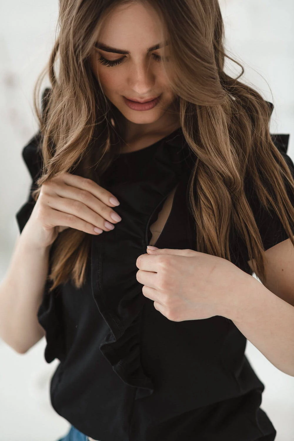 In diesem Angebot bieten wir eine schwarze Bluse mit dekorativer Rüsche für frischgebackene Mütter an, sorgfältig genäht in Polen von der renommierten Marke Milk & Love, deren Umstands- und Stillstil seit Jahren von Frauen während der Schwangerschaft und nach der Geburt beim Stillen geschätzt wird ihr Baby. Stylische Blusen für stillende Frauen im Slow-Fashion-Gedanken garantieren, dass unsere Umstands- und Stilloberteile auch später noch gut funktionieren, denn die Reißverschlüsse, durch die Sie nach dem Schwangerschaftsabenteuer stillen, sind sehr gut versteckt, in diesem Fall hinter bezaubernden Rüschen.