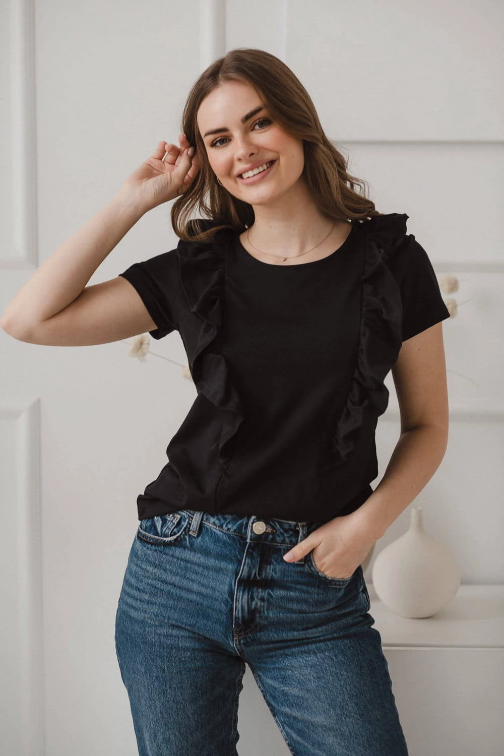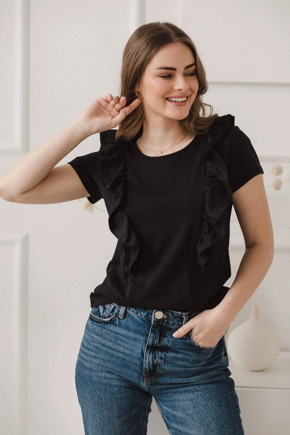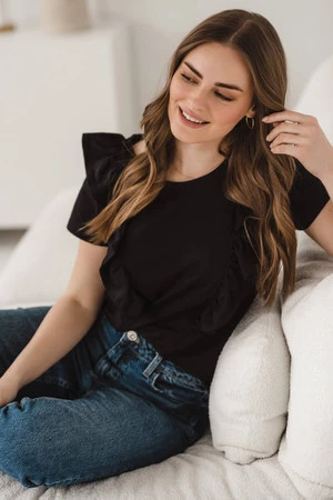 Eine perfekte schwarze Bluse für stillende Frauen mit kurzen Ärmeln und einer dekorativen Rüsche, die die Stillreißverschlüsse perfekt verdeckt. Eine modische Bluse für junge Mütter ist die Quintessenz von Stil und Weiblichkeit in der Garderobe. Mit Sommerblusen mit bequemen Reißverschlüssen zum Stillen können Sie Ihr Baby auch an öffentlichen Orten wie einer Galerie oder einem Park diskret und problemlos füttern. Eine perfekte Bluse, die sowohl im Alltag als auch zu wichtigeren Anlässen zu Rock, Hose oder Leggings passt.