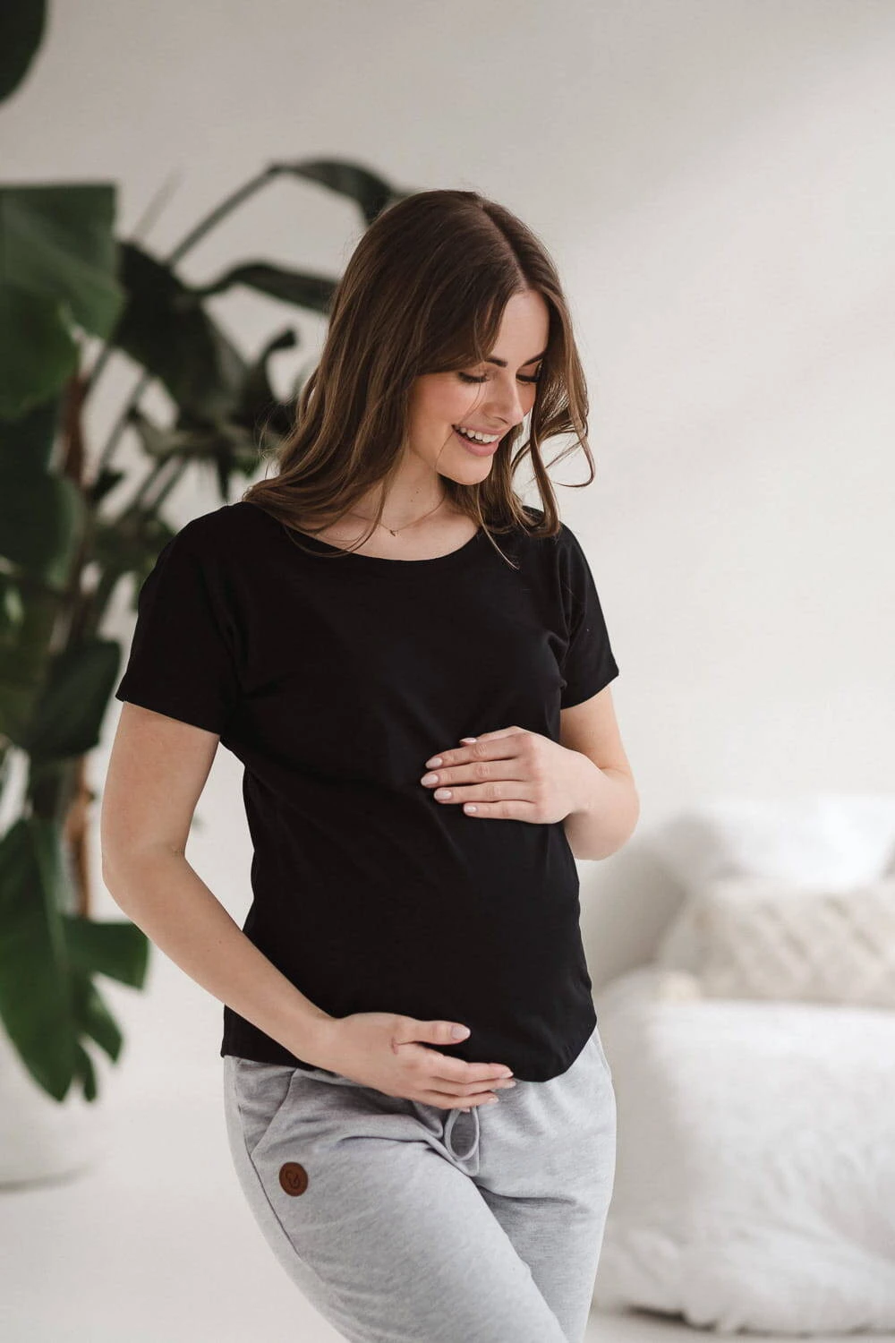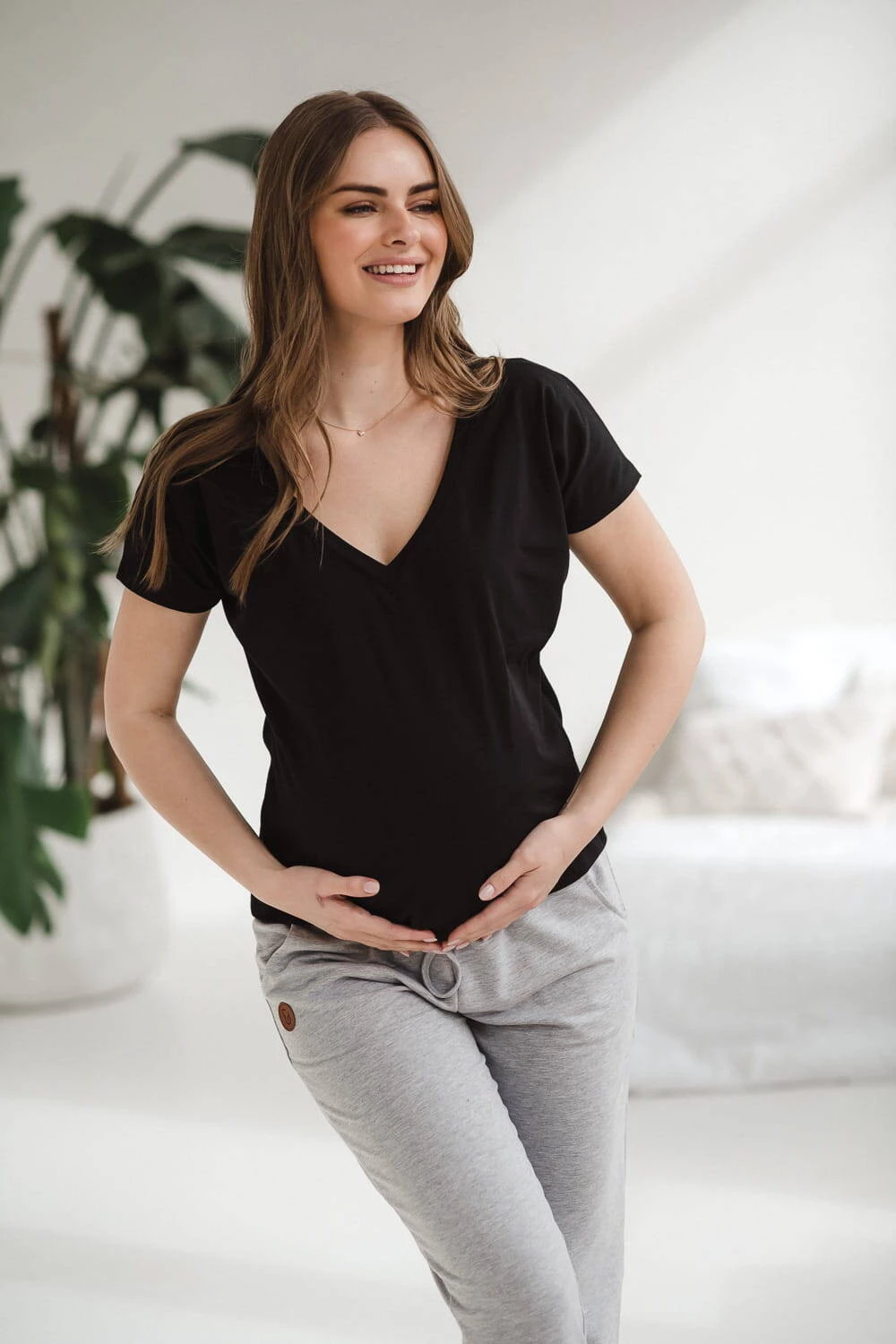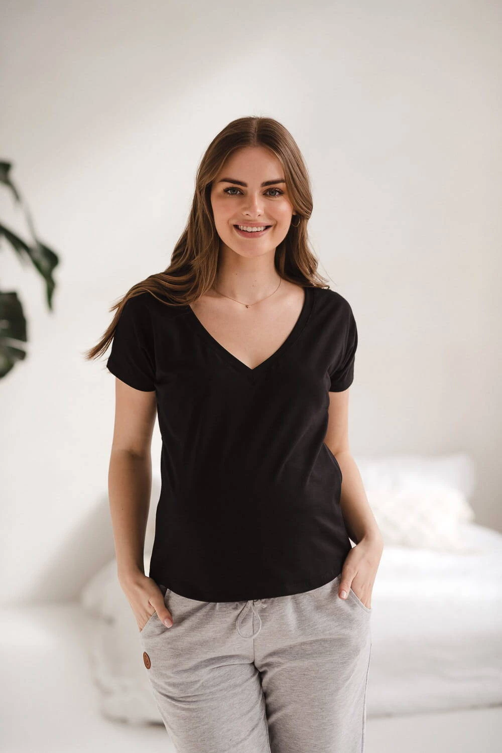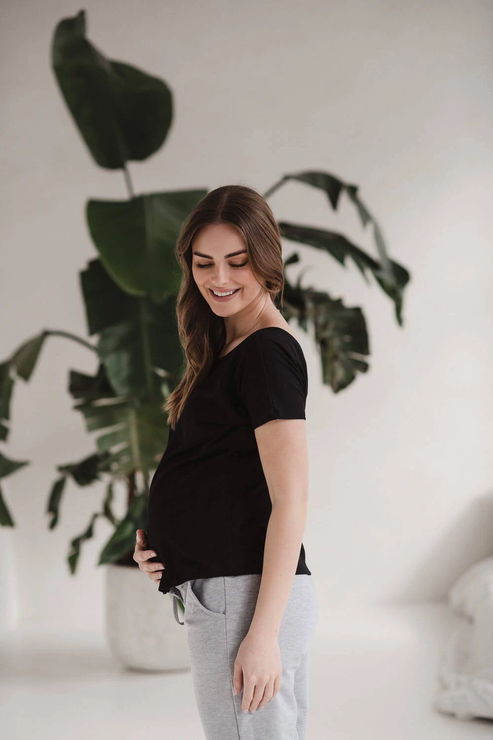 Eine doppelseitige schwarze, perfekte Umstandsbluse für stillende Frauen im Basic-Stil. Eine modische Umstandsbluse und für frischgebackene Mütter ist die Quintessenz von Stil und Weiblichkeit in der Garderobe. Sommerliche Umstandsblusen mit bequemen Reißverschlüssen zum Füttern ermöglichen es Ihnen, Ihr Baby auch an öffentlichen Orten wie einer Galerie oder einem Park diskret und einfach zu füttern. Wie jede Basic-Damenbluse ist diese feminine Umstandsbluse für werdende Mütter ein perfekter Umstandsstil und eine Basis für Ihr Alltags-Styling.