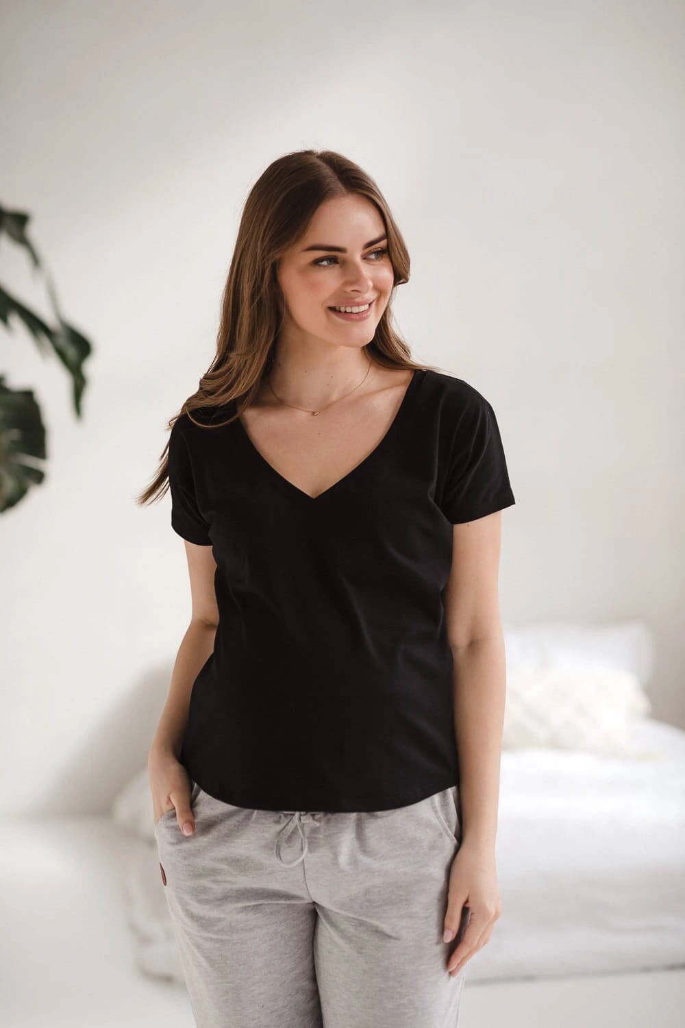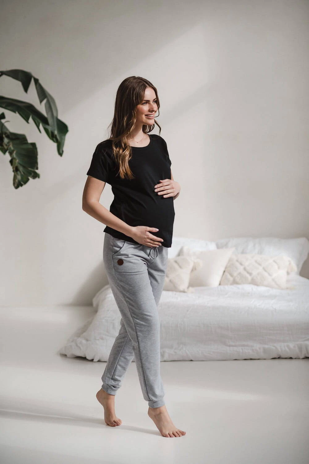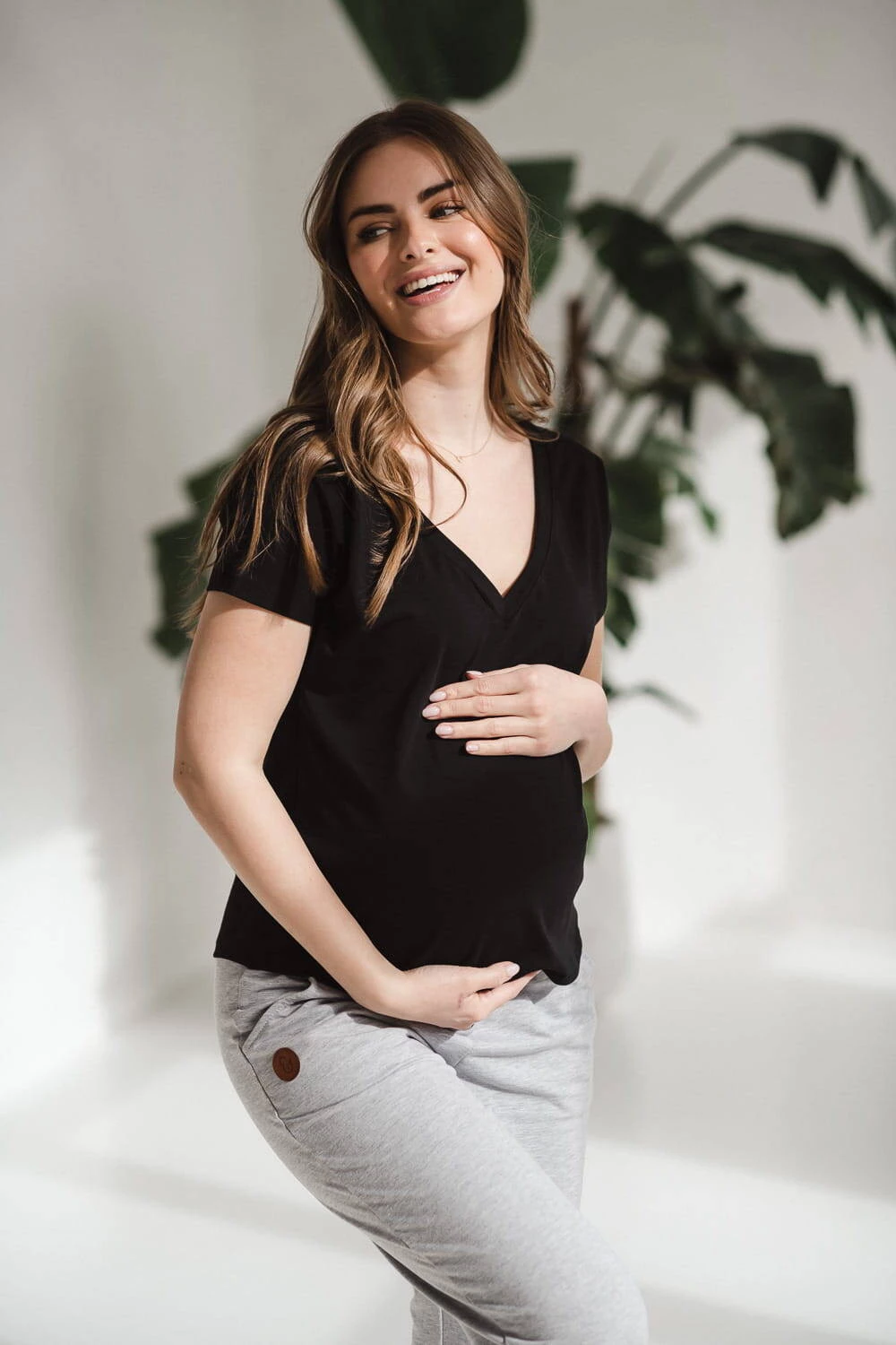 Eine doppelseitige schwarze, perfekte Umstandsbluse für stillende Frauen im Basic-Stil. Eine modische Umstandsbluse und für frischgebackene Mütter ist die Quintessenz von Stil und Weiblichkeit in der Garderobe. Sommerliche Umstandsblusen mit bequemen Reißverschlüssen zum Füttern ermöglichen es Ihnen, Ihr Baby auch an öffentlichen Orten wie einer Galerie oder einem Park diskret und einfach zu füttern. Wie jede Basic-Damenbluse ist diese feminine Umstandsbluse für werdende Mütter ein perfekter Umstandsstil und eine Basis für Ihr Alltags-Styling.