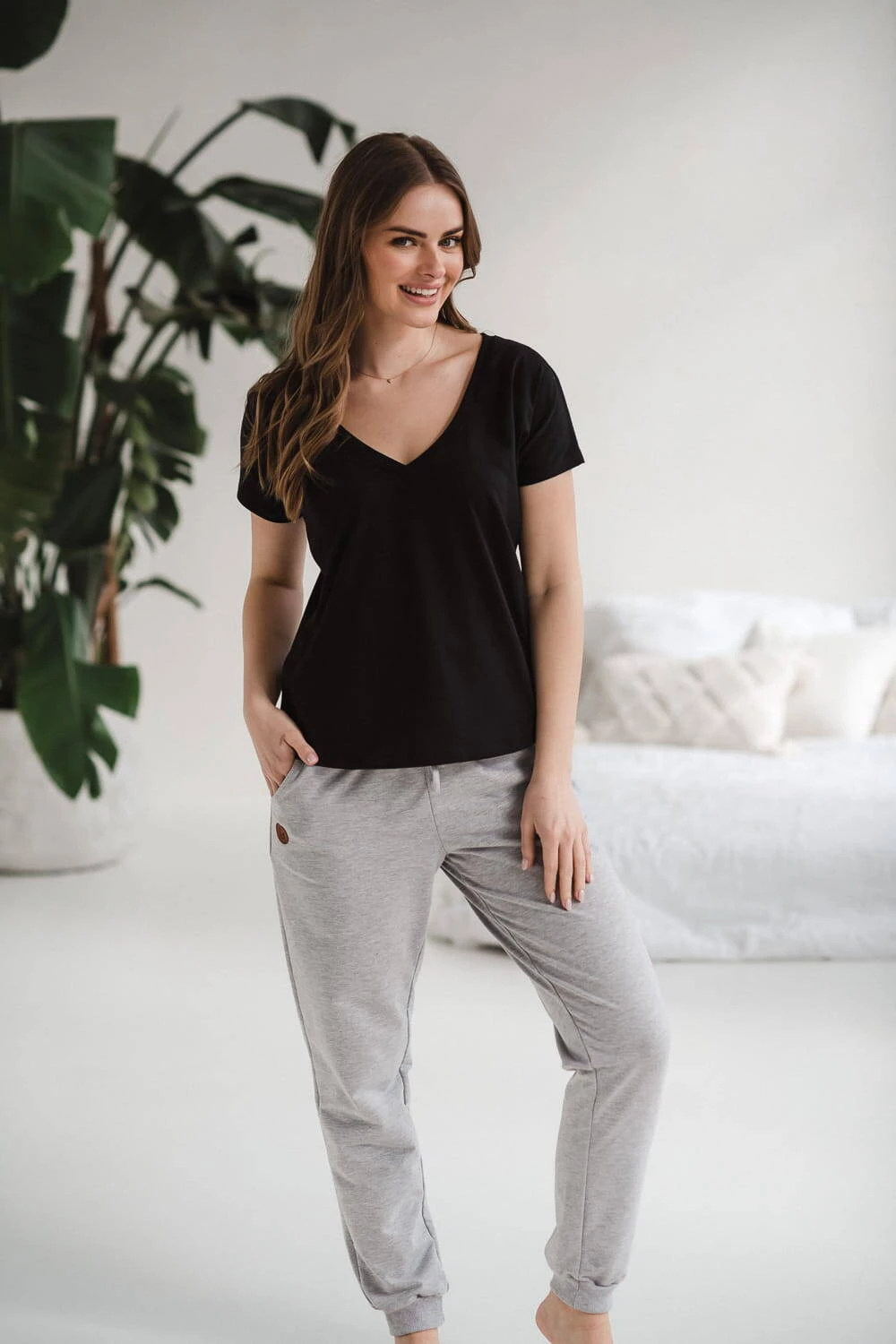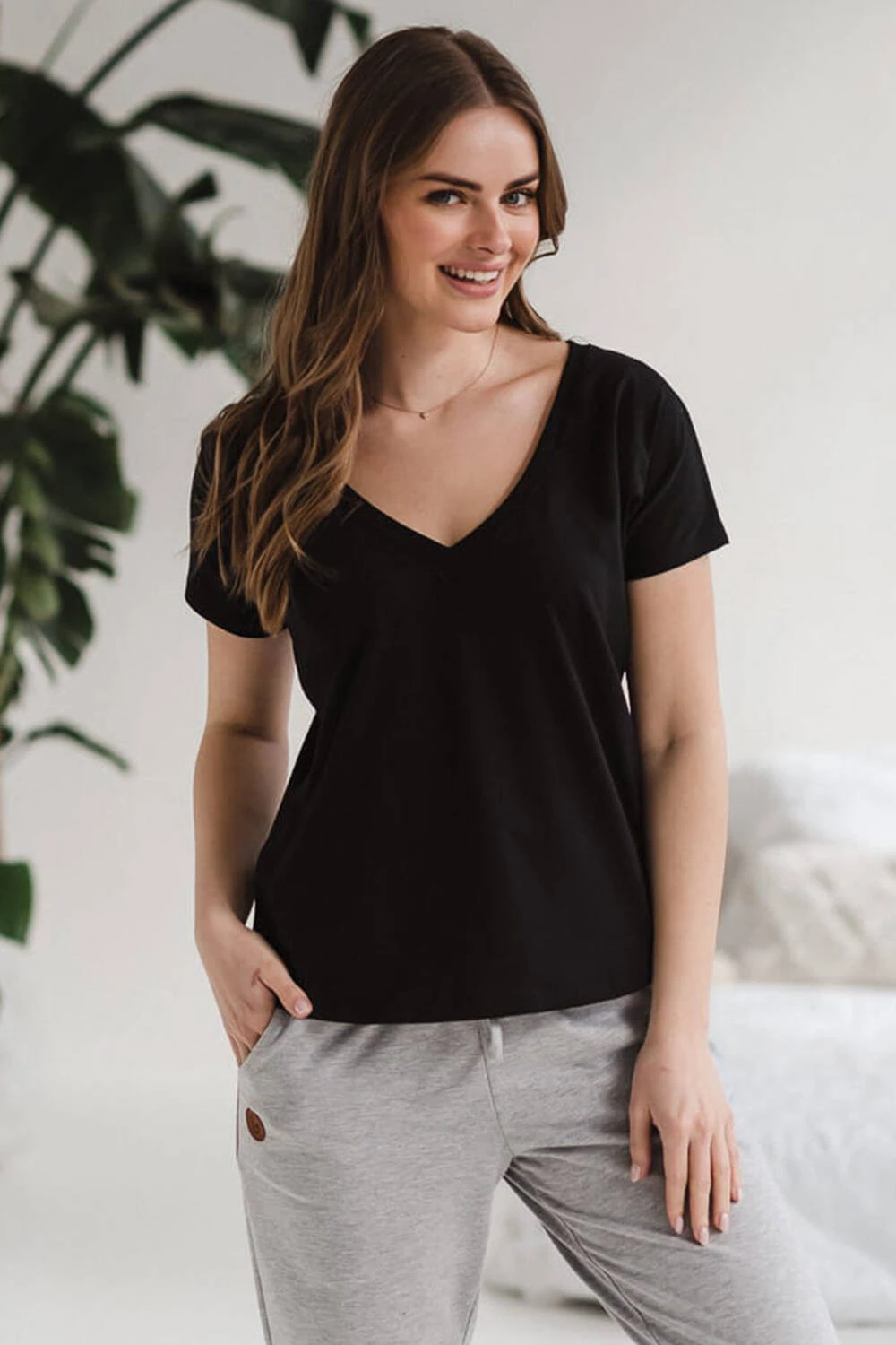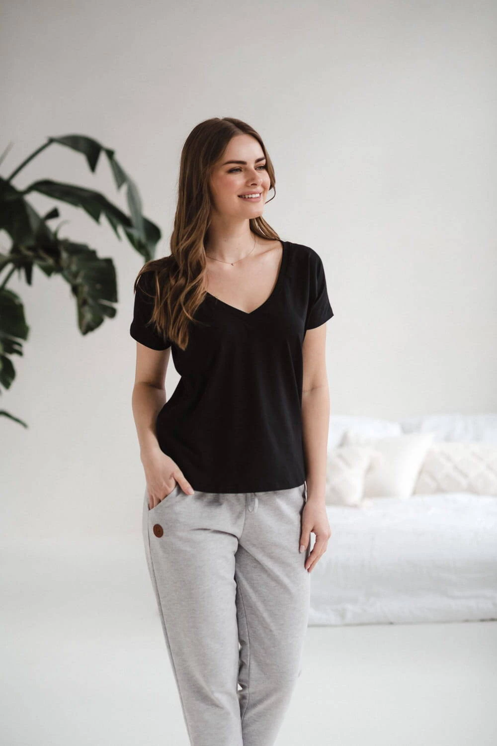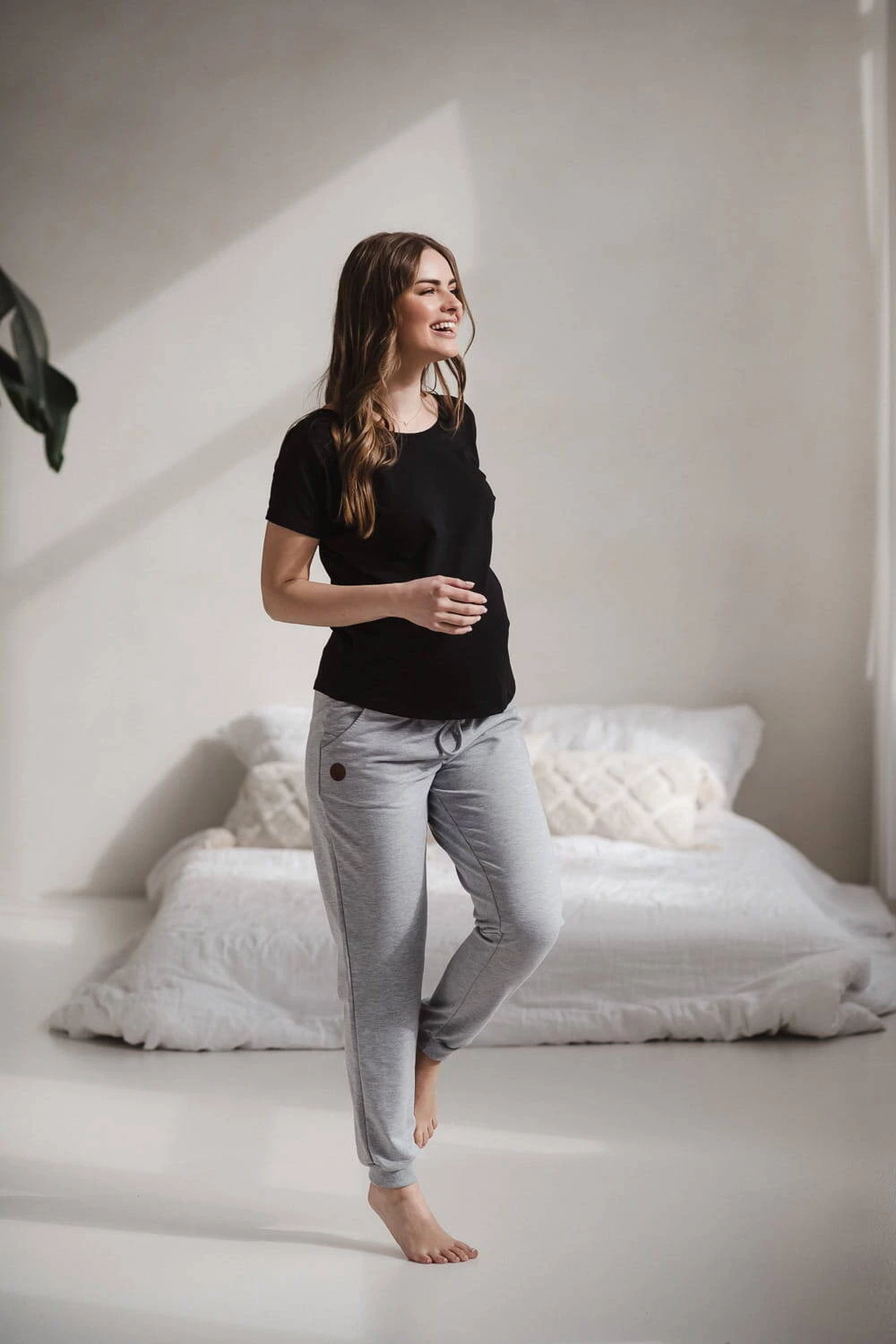 Eine doppelseitige schwarze, perfekte Umstandsbluse für stillende Frauen im Basic-Stil. Eine modische Umstandsbluse und für frischgebackene Mütter ist die Quintessenz von Stil und Weiblichkeit in der Garderobe. Sommerliche Umstandsblusen mit bequemen Reißverschlüssen zum Füttern ermöglichen es Ihnen, Ihr Baby auch an öffentlichen Orten wie einer Galerie oder einem Park diskret und einfach zu füttern. Wie jede Basic-Damenbluse ist diese feminine Umstandsbluse für werdende Mütter ein perfekter Umstandsstil und eine Basis für Ihr Alltags-Styling.