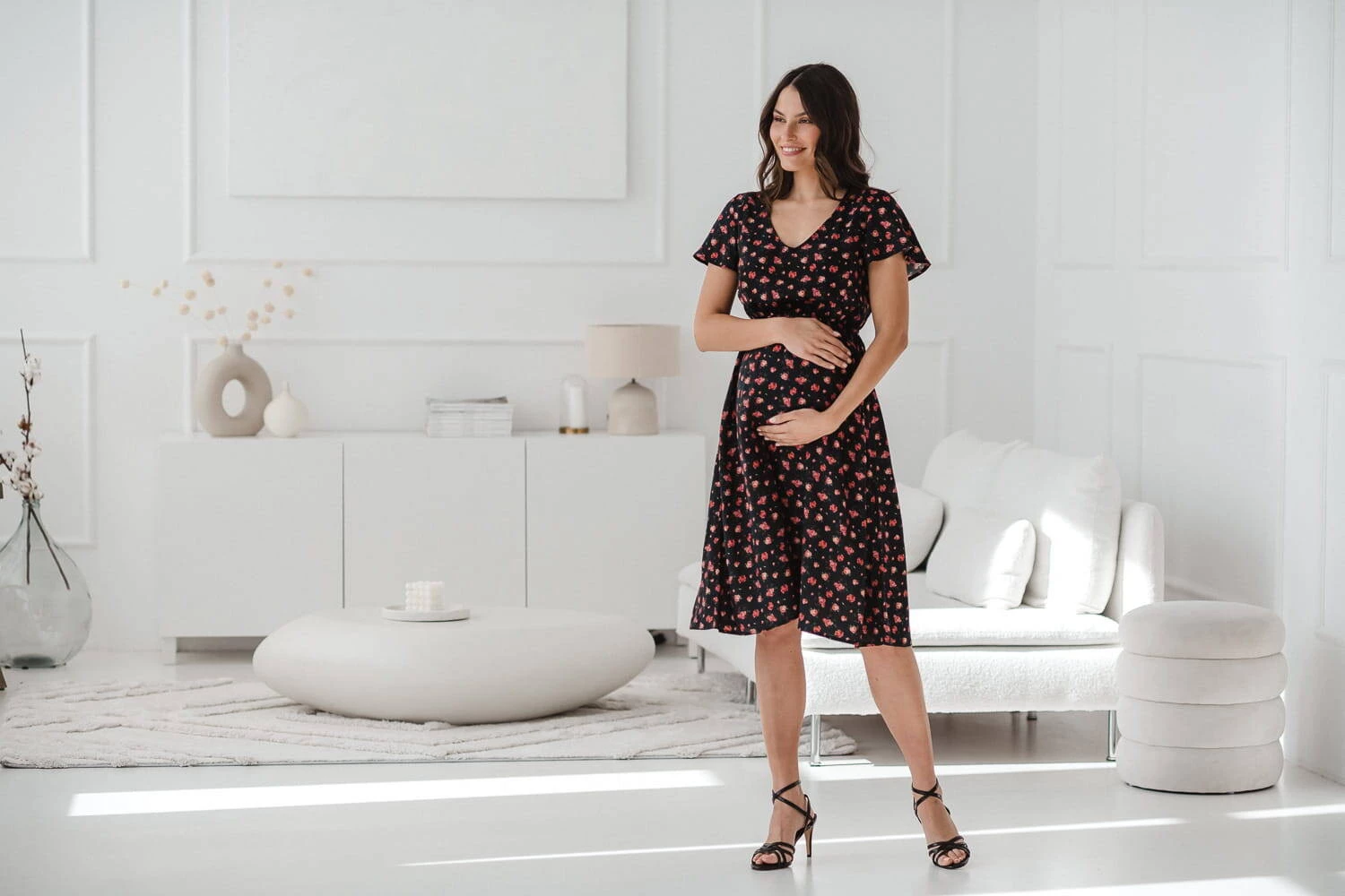 Wählen Sie einzigartige Kleider für schwangere Frauen! Wählen Sie ein elegantes, klassisches Midikleid mit 3/4-Ärmeln und einem femininen rosa Aufdruck auf marineblauem Hintergrund. Unser einzigartiges Stillkleid aus zarter 100 % Viskose sorgt nicht nur während der Schwangerschaft, sondern auch danach für ein feminines und angenehmes Tragegefühl und ermöglicht diskretes Stillen auch an öffentlichen Orten. Kleider für Mütter aus unserer Lovely Dress- Kollektion gibt es in verschiedenen Farben, Modellen und Drucken, die Sie vom ersten Trimester der Schwangerschaft bis zur Zeit nach der Geburt begleiten können.