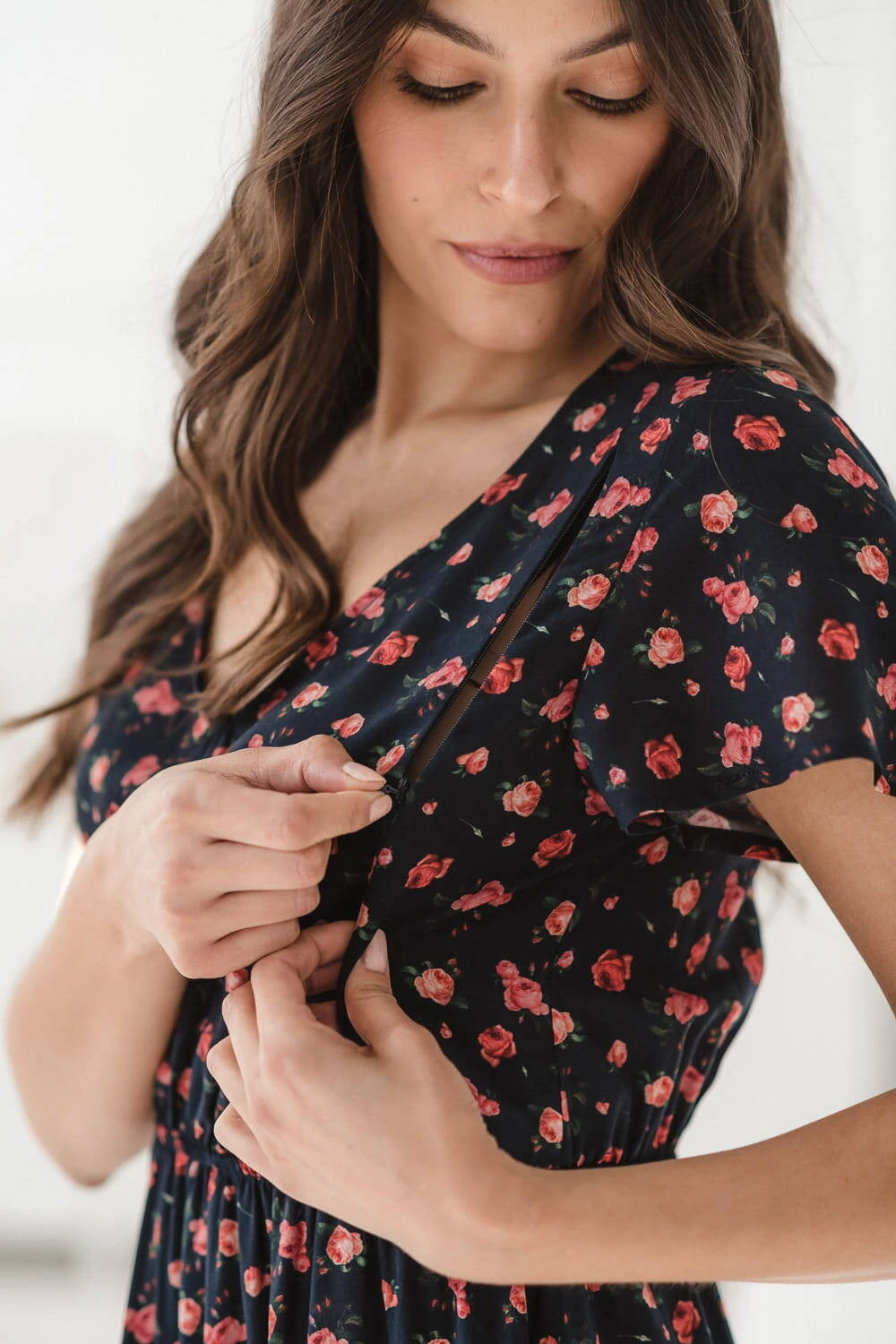 Lovely Dress Umstands- und Stillkleid, kurze Ärmel – Marineblau mit Rosen