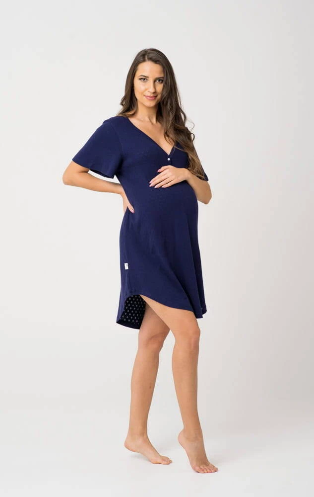 Wir möchten Ihnen ein schönes und funktionelles Goodnight Kiss Nachthemd für die Geburt und Stillzeit in klassischem Marineblau präsentieren. Dieses äußerst zarte und weiche, durchbrochene Hemd für schwangere und stillende Frauen wurde für Frauen geschaffen, die höchsten Komfort erwarten. Das Stillshirt besteht aus 100 % Baumwolle, einem natürlichen Stoff, der für hervorragende Schlafbedingungen sorgt. Sein lockerer Schnitt und die dehnbaren Stoffeigenschaften passen sich problemlos Ihrem wachsenden Bauch an und sorgen für Komfort in jeder Phase der Schwangerschaft. Darüber hinaus erleichtert der geknöpfte Ausschnitt das Füttern Ihres Babys in der Nacht, sodass dieses universelle, bequeme Hemd Sie von den ersten Augenblicken der Schwangerschaft bis zur Geburt Ihres Babys begleiten wird.