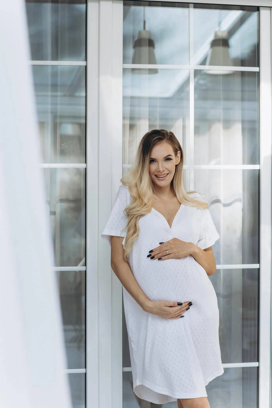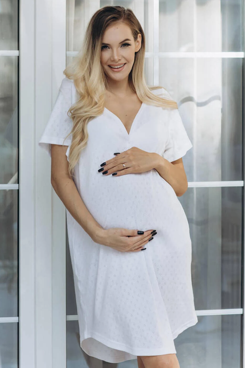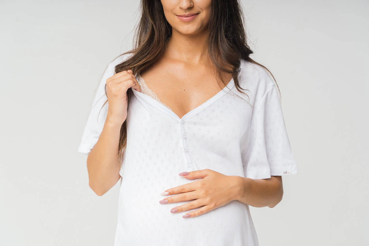 Wir möchten Ihnen ein schönes und funktionelles Goodnight Kiss Nachthemd für die Geburt und Stillzeit in klassischem Weiß präsentieren. Dieses äußerst zarte und weiche, durchbrochene Hemd für schwangere und stillende Frauen wurde für Frauen geschaffen, die höchsten Komfort erwarten. Das Stillshirt besteht aus 100 % Baumwolle, einem natürlichen Stoff, der für hervorragende Schlafbedingungen sorgt. Sein lockerer Schnitt und die dehnbaren Stoffeigenschaften passen sich problemlos Ihrem wachsenden Bauch an und sorgen für Komfort in jeder Phase der Schwangerschaft. Darüber hinaus erleichtert der geknöpfte Ausschnitt das Füttern Ihres Babys in der Nacht, sodass dieses universelle, bequeme Hemd Sie von den ersten Augenblicken der Schwangerschaft bis zur Geburt Ihres Babys begleiten wird.