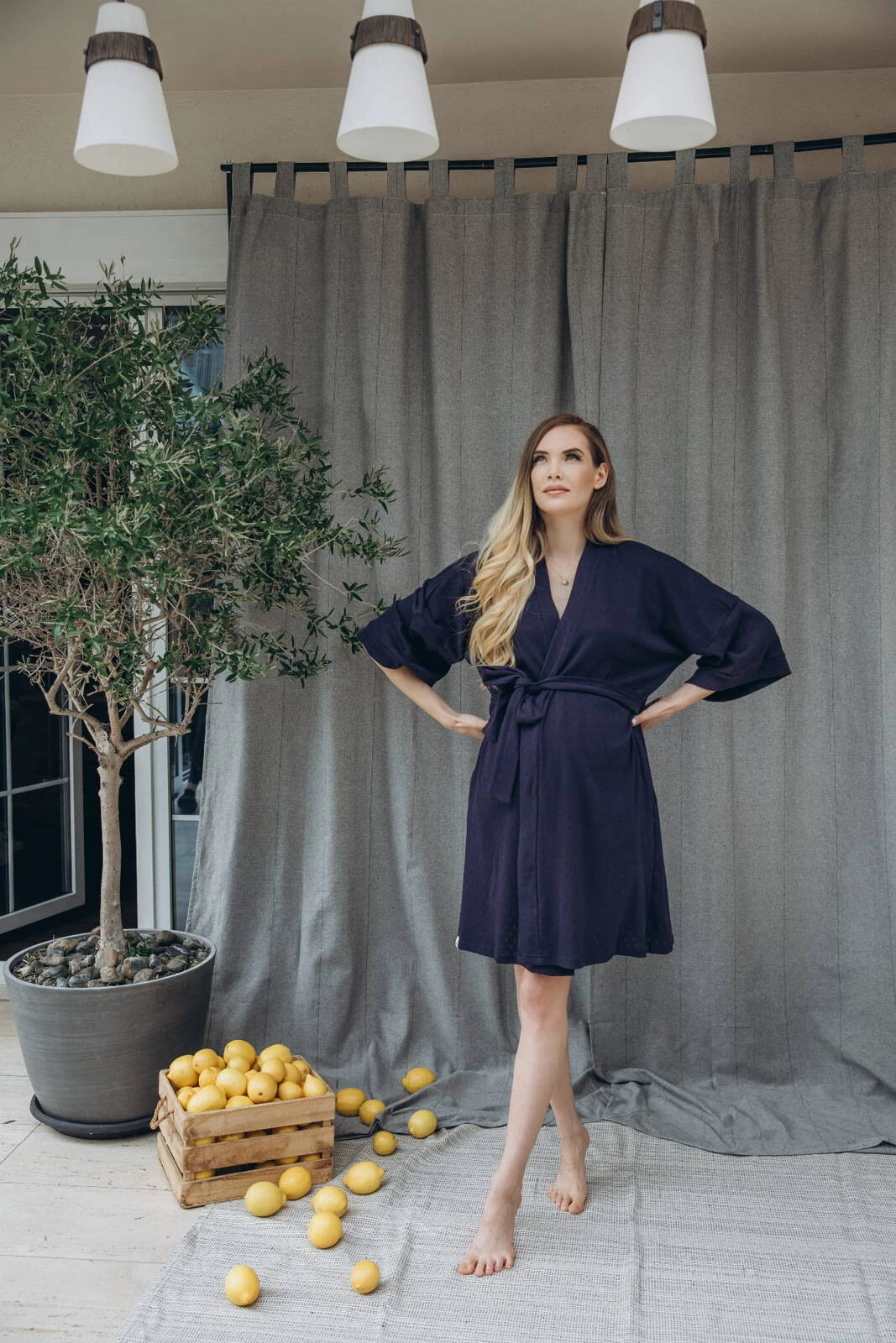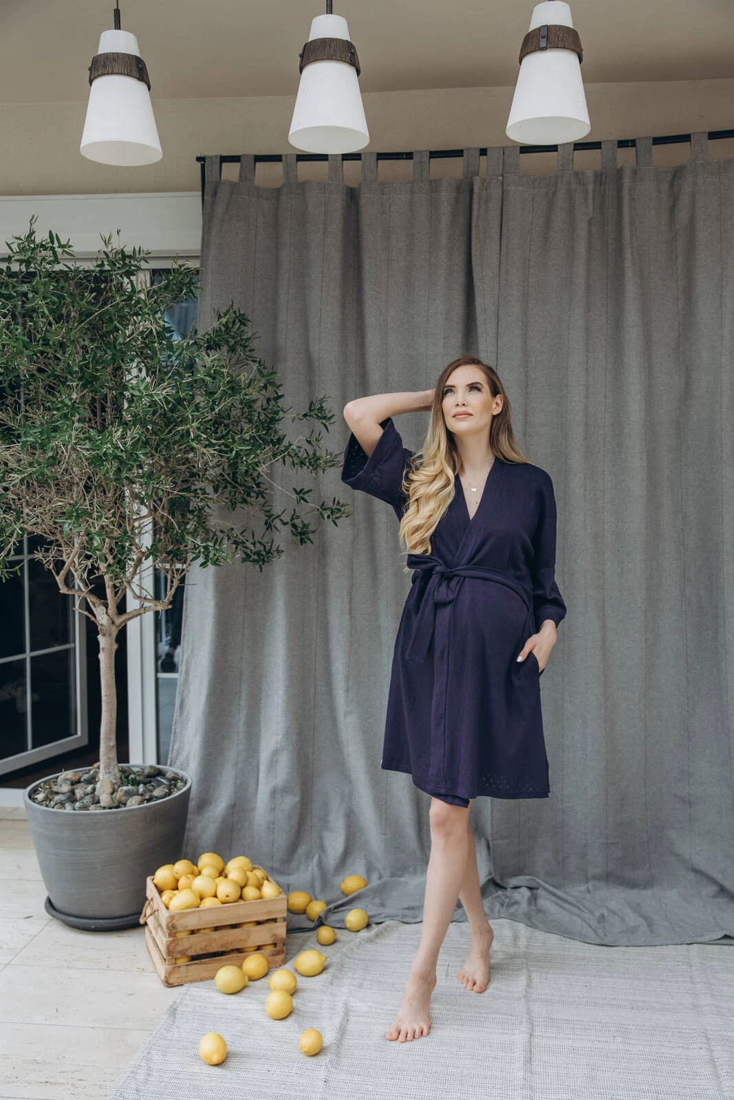 Wir präsentieren Ihnen den Umstands-Kimono-Bademantel in Marineblau. Ein Umstandsbademantel aus Baumwolle ist ein einzigartiges Produkt, das speziell dafür entwickelt wurde, Sie von den ersten Momenten der Schwangerschaft bis zur Geburt Ihres Kindes zu begleiten, und sogar noch später, wenn Sie Ihr Baby schon längst mit dem Stillen fertig haben. Ein bequemer und stilvoller Umstandsbademantel ist eine Kombination aus Funktionalität und Komfort, dank seines lockeren Schnitts und einer Vielzahl von Verstellmöglichkeiten, die eine einfache Anpassung an den wachsenden Bauch ermöglichen. Auch nach der Geburt Ihres Babys werden Sie Freude an diesem durchbrochenen Umstandsbademantel aus Baumwolle haben.