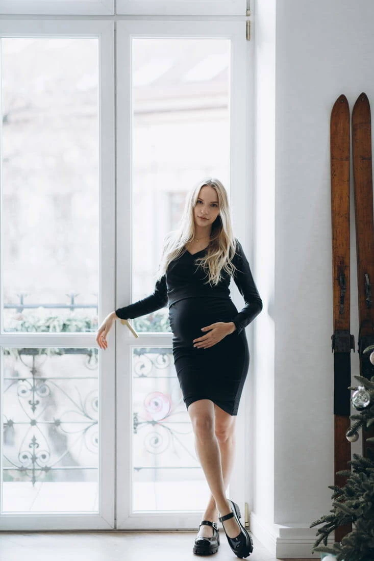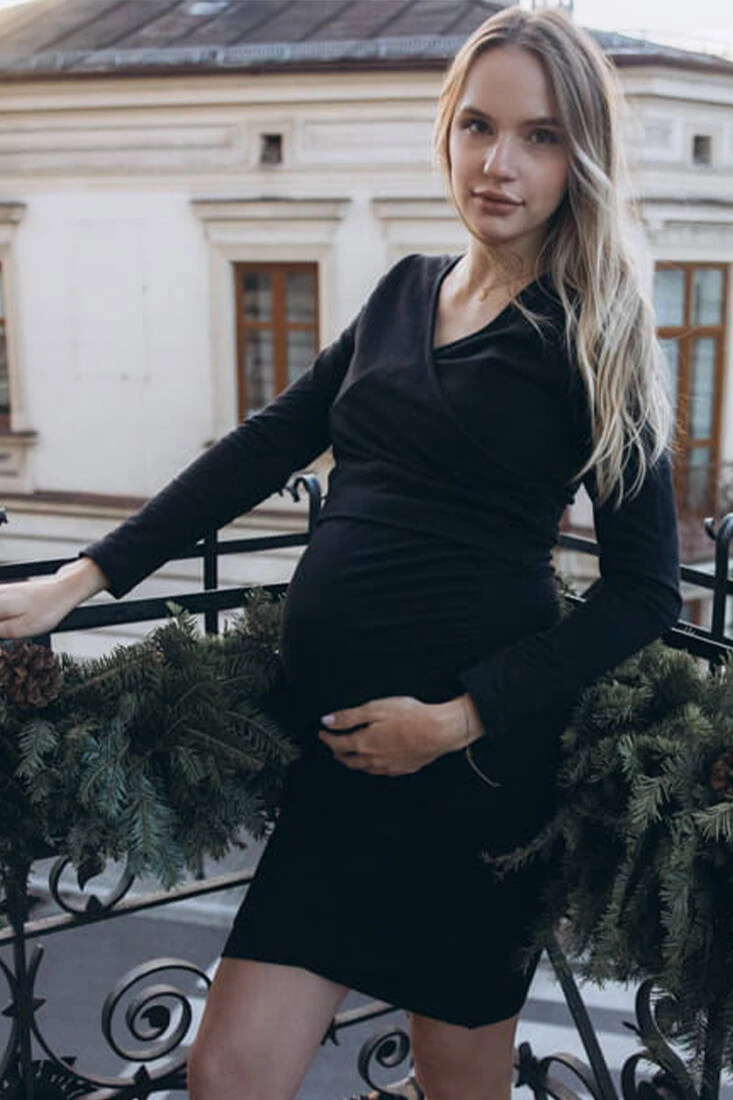 Ein klassischer schwarzer Umstandsrock und eine bequeme Wickelbluse „Latte Mama“ ist ein Umstands- und Stillset, das speziell für den Komfort und die Bequemlichkeit zukünftiger Mütter entwickelt wurde. Umstandskleidung aus sehr elastischem Baumwollstoff, wie zum Beispiel ein dünner Trainingsanzug, schmiegt sich perfekt an den wachsenden Bauch an und sorgt so für Tragekomfort während der gesamten Schwangerschaft. Später ermöglicht die Bluse dank des bequemen Schnitts ein einfaches und diskretes Stillen. Durch das flexible Material schränken sowohl der Damen-Umstandsrock als auch die bequeme Bluse die Bewegungsfreiheit nicht ein und eignen sich hervorragend für den Alltag.
