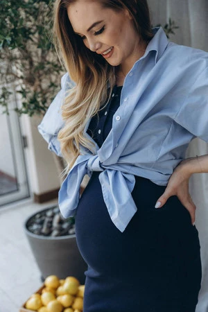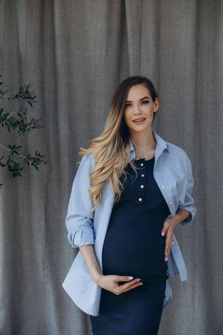 Die blaue Farbe macht die Bluse universell und lässt sich problemlos mit verschiedenen Kleidungsstücken kombinieren, wodurch Stile sowohl für den Alltag als auch für formellere Anlässe entstehen. Der lockere Schnitt und die Elastizität des Materials sorgen für Bewegungsfreiheit und Komfort, der sowohl während der Schwangerschaft als auch nach der Geburt notwendig ist. Lange Ärmel, die hochgekrempelt werden können, verleihen der Bluse Funktionalität und Stil.
