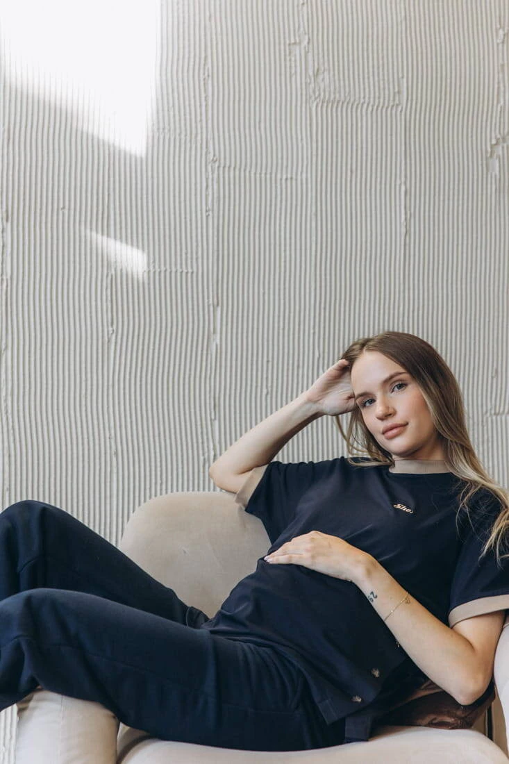 Für zukünftige Mütter und stillende Mütter wurde ein elegantes und bequemes marineblaues T-Shirt mit Kaffeebesatz und Knöpfen an den Seiten entworfen. Hergestellt aus Baumwolle höchster Qualität, garantiert es den ganzen Tag über maximalen Komfort, unabhängig von den Umständen. Der lockere, übergroße Schnitt sorgt für Bewegungsfreiheit und zusätzlichen Platz für den wachsenden Schwangerschaftsbauch. Marineblaues Damen-Umstands-T-Shirt aus Baumwolle, das sich nicht nur weich und angenehm anfühlt, sondern auch luftig ist, was für den Tragekomfort entscheidend ist. Das Material ist nach OEKO-TEX Standard 100 zertifiziert, was bedeutet, dass der Stoff auf Schadstoffe getestet wurde, völlig unbedenklich für die Haut ist und keine Reizungen oder Allergien verursacht.