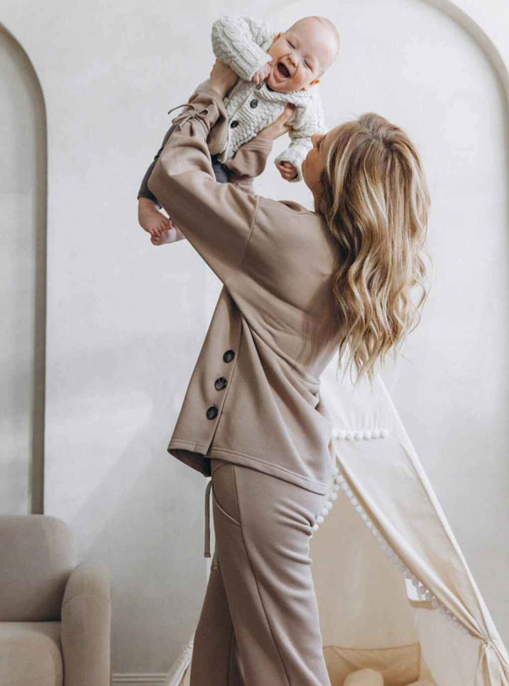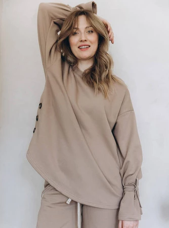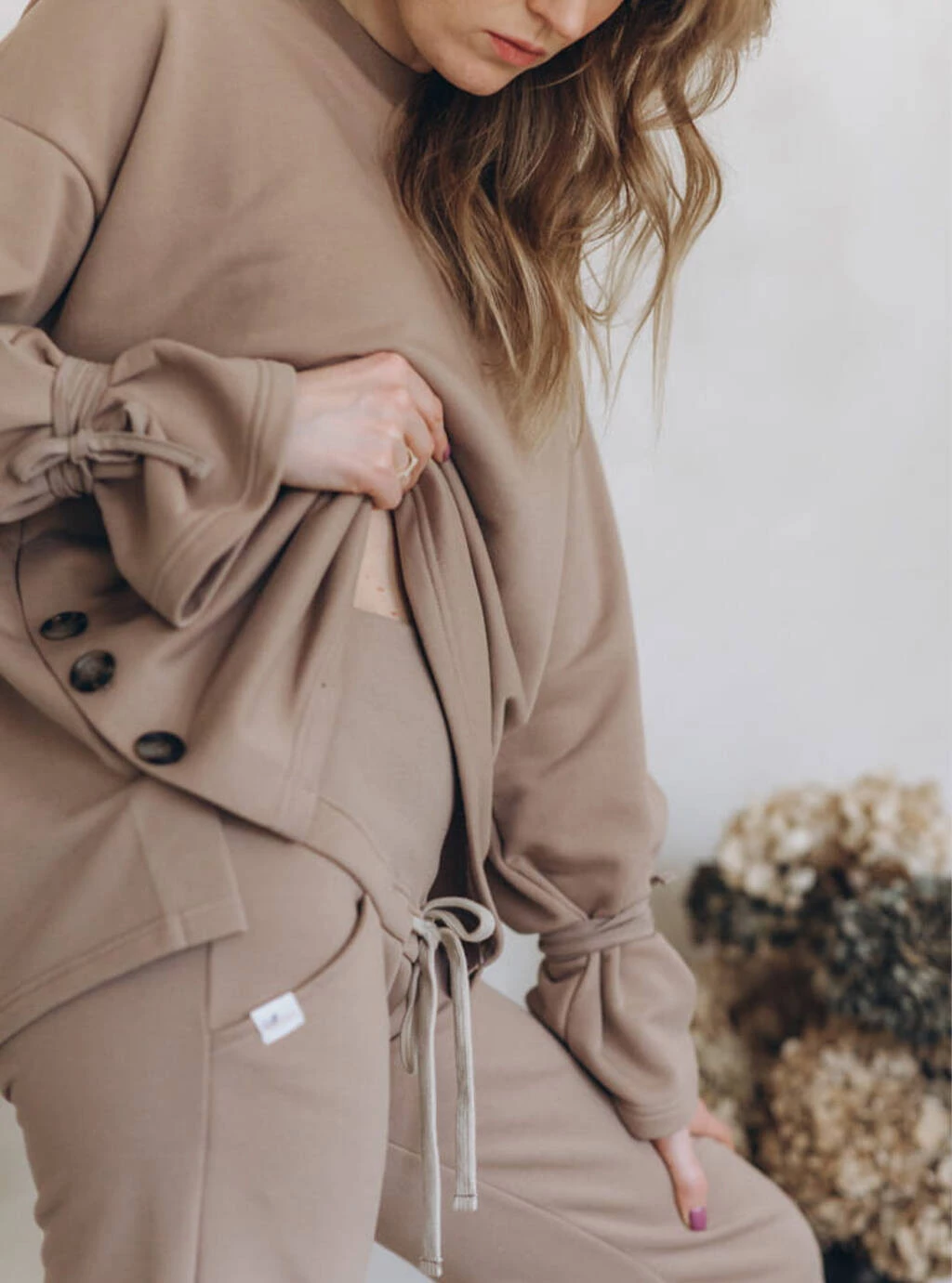 Beigefarbenes Umstands-Sweatshirt mit Knöpfen an den Seiten, entworfen für diskretes Stillen in jeder Situation. Dieses Umstands-Sweatshirt mit Kordelzug an den Ärmeln aus hochwertigster Baumwolle sorgt sowohl während der Schwangerschaft als auch nach der Geburt für Bewegungsfreiheit und ausreichende Luftzirkulation.