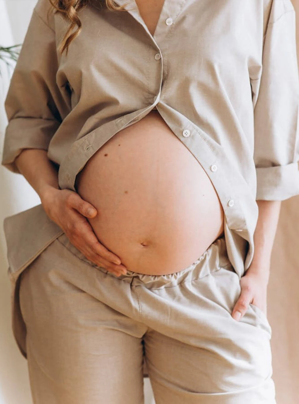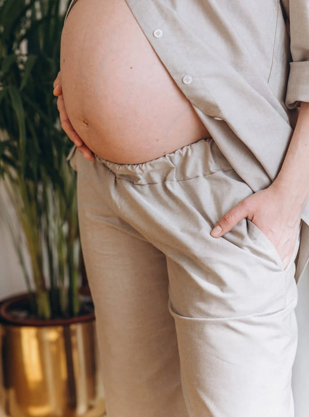Lockere Umstandshosen mit niedrigem Bund und zartem Gummiband sind für schwangere Frauen konzipiert und sorgen für eine perfekte Passform und absoluten Tragekomfort. Der speziell abgesenkte Gürtel an der Vorderseite passt sich perfekt dem wachsenden Bauch an, ohne Druck auszuüben. Die Hose sitzt gut auf der Hüfte und verrutscht nicht, was für ein angenehmes Tragegefühl sorgt. Durch den Verzicht auf einen zusätzlichen Bauchgurt sind sie leicht und wärmen den Bauch an heißen Tagen nicht zusätzlich. Diese einzigartige Hose kann sowohl während als auch nach der Schwangerschaft getragen werden.