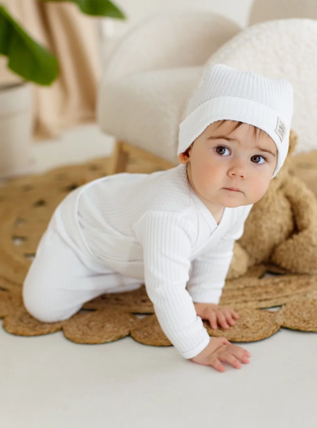 Natürliche Waffel-Babymütze – Weiß