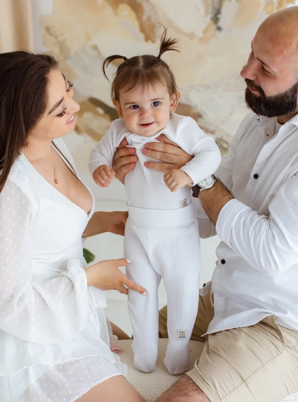Polnische Babykleidung der bekannten Marke Makoma aus Waffelbaumwolle, die sanft zur Babyhaut ist. Schlafanzüge aus extrem weicher Baumwolle sorgen für Komfort und Bewegungsfreiheit, während Ihr Baby die Welt erkundet. Weiße Baby-Leggings mit Absatz verhindern, dass kleine Füße herausrutschen und auskühlen. Entscheiden Sie sich heute für weiße Schlafanzüge mit einem zarten Bündchen, das den empfindlichen Bauch Ihres Babys schützt und verhindert, dass es drückt oder schwitzt.