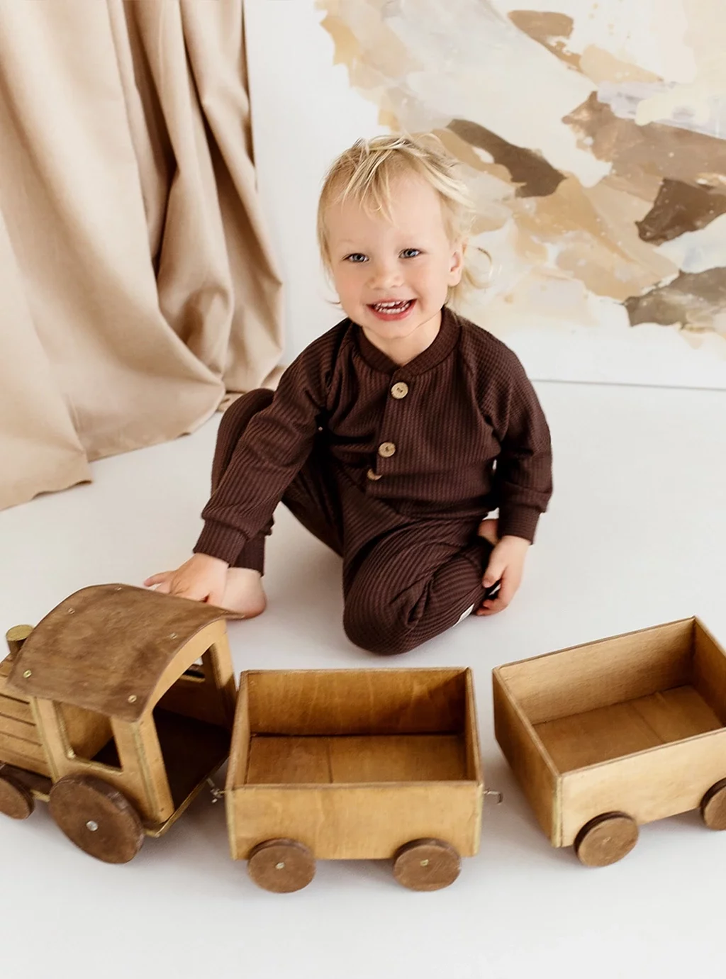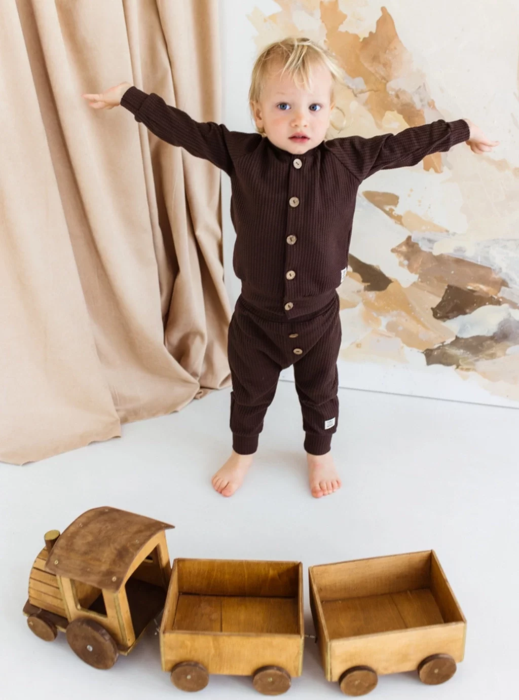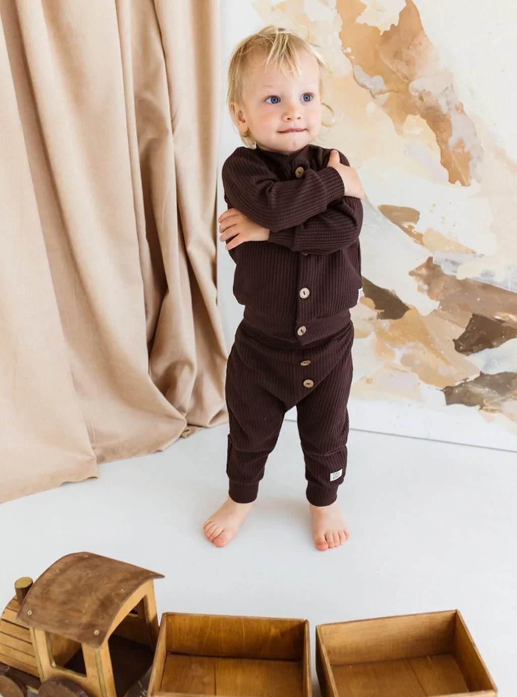 Ein Baby-Sweatshirt aus kaffeefarbener Waffelbaumwolle ist ein cooles Outfit und hochwertiger Wärmekomfort. Wenn Sie möchten, dass Ihr Kind beim Spaziergang an einem kalten Tag perfekt aussieht, ist ein Baby-Sweatshirt mit Rock oder Shorts die perfekte Lösung! sowohl für ein kleines Mädchen als auch für einen Jungen. Ein mokkafarbenes Sweatshirt mit Reißverschluss und dekorativen Holzknöpfen ist eine ausgezeichnete Anschaffung, die nicht nur ein schönes Aussehen, sondern auch einen hohen Tragekomfort bietet!