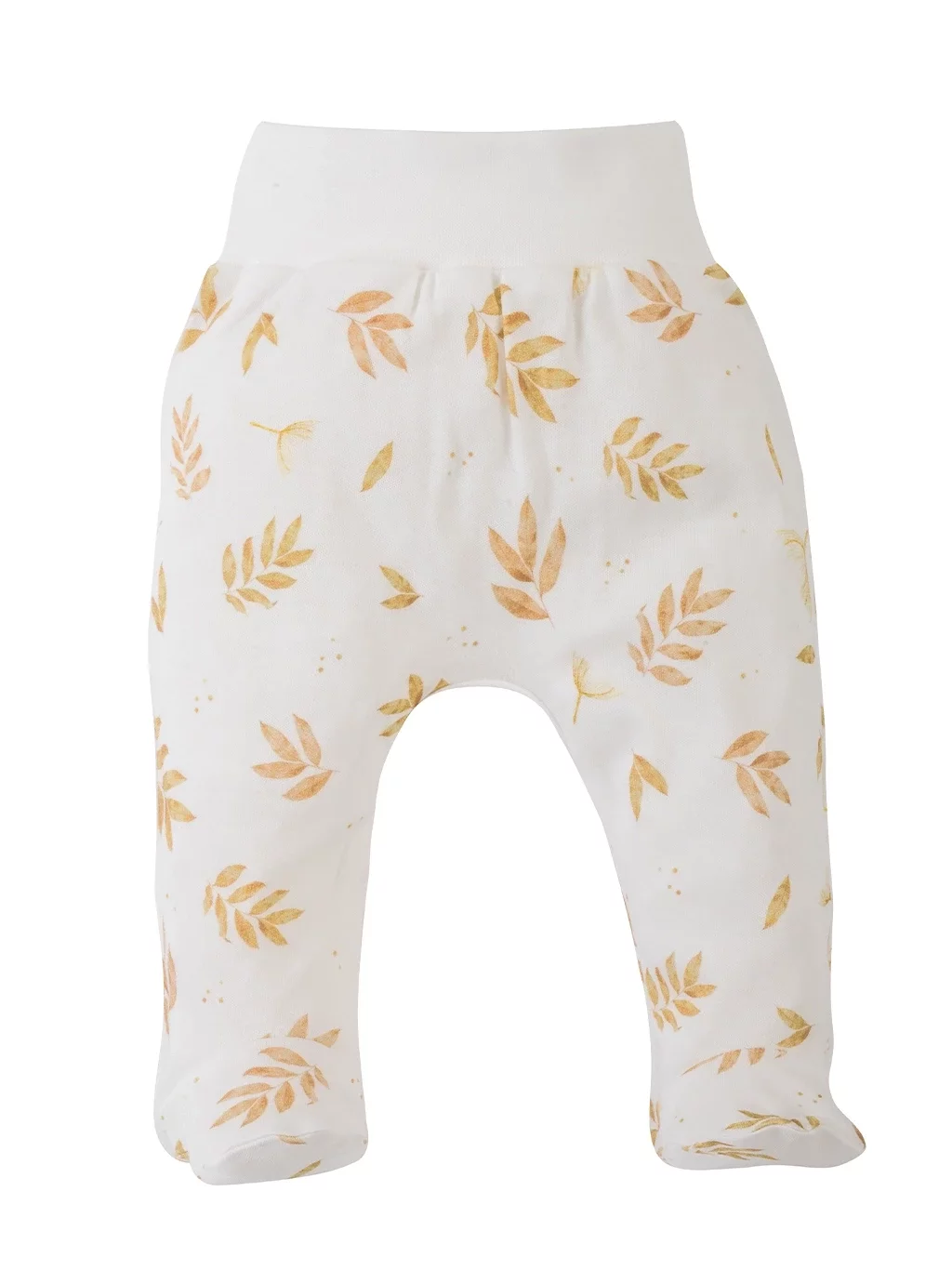 Perfekte Makoma-Baby-Schlafanzüge mit zarten goldenen Blättern bestehen aus Baumwolle, die für das Baby sicher ist und Komfort beim Tragen und Benutzen gewährleistet. Klassischer Stil und ein Gürtel mit einem zarten Kordelzug, der nicht drückt und für Komfort um den zarten Bauch des Babys sorgt. Mit Absätzen genähte Babykleidung verhindert, dass kleine Babyfüße schon in den ersten Momenten des Lebens frieren.