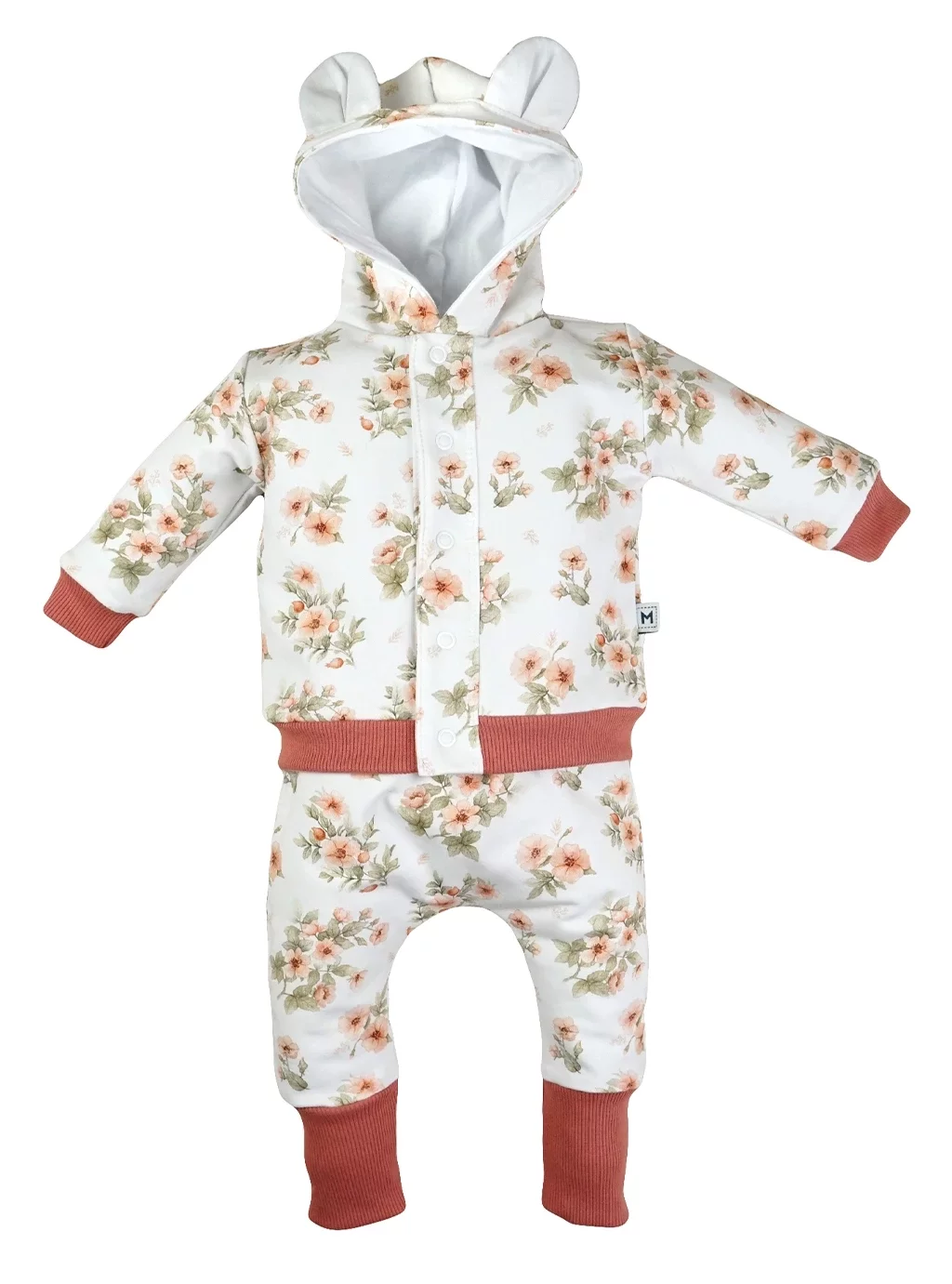 Ein bezauberndes Set bestehend aus einer Hose mit bequemem, nicht einengenden Bund und einem bequemen Sweatshirt mit Kapuze, dessen Ohren mit nickelfreien Druckknöpfen befestigt werden. Wenn Sie nicht wissen, was Sie Ihrem Baby anziehen sollen, entscheiden Sie sich für einzigartige Babysets der Marke Mrofi, die nicht nur einen coolen Look, sondern auch hohen Komfort, Sicherheit und Bewegungsfreiheit bieten. Der Baumwollbund in der Hose drückt nicht auf den Bauch, was bei der Entwicklung äußerst wichtig ist. Ein Sweatshirt mit kleinen Blumen ist perfekt für kältere Tage. Für Ihre Bequemlichkeit wird es mit bequemen, nickelfreien Druckknöpfen geschlossen, die bei Ihrem Baby keine Allergien auslösen, selbst wenn es eine zu Allergien neigende Haut hat.
