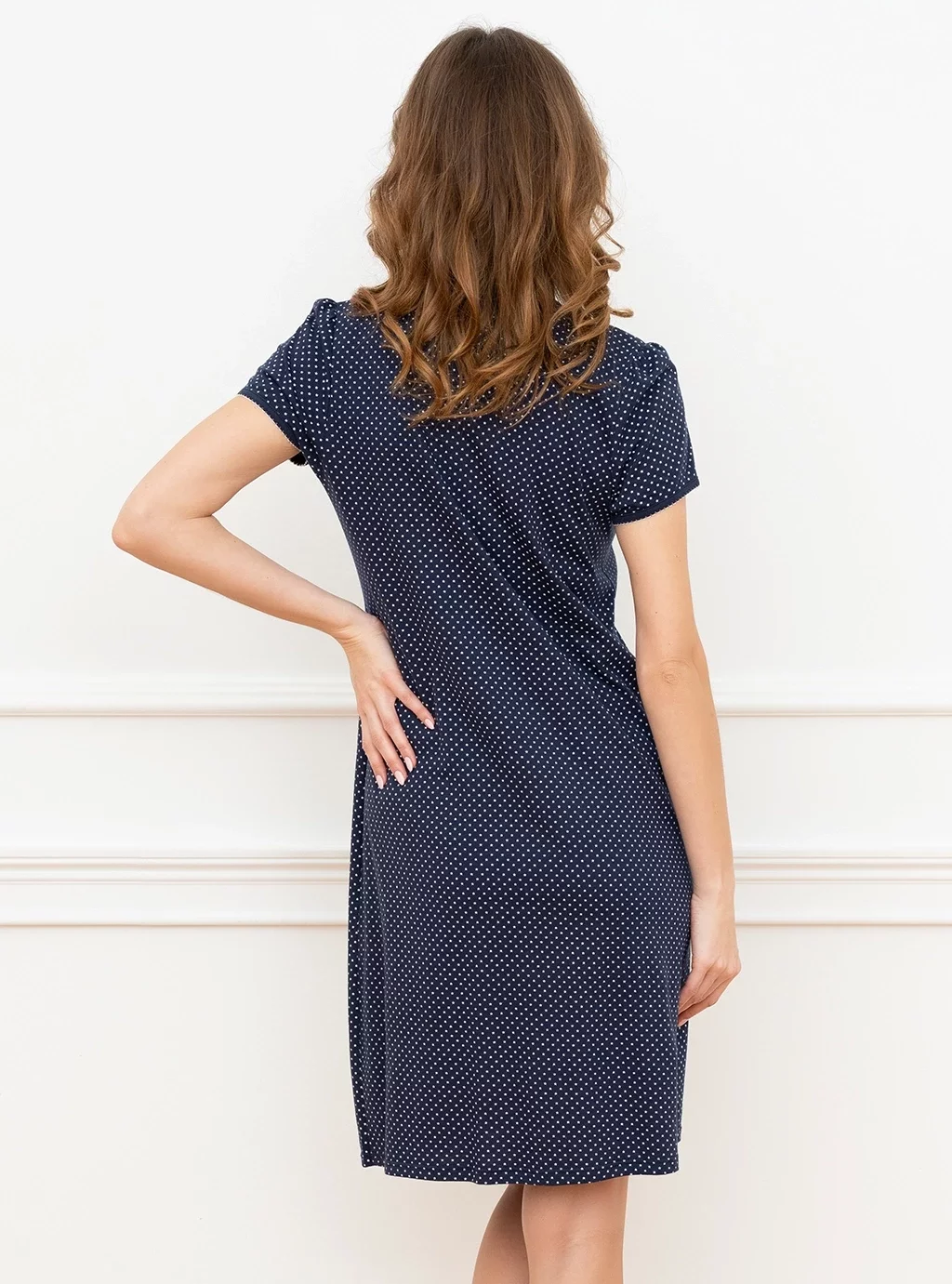Ein marineblaues Umstandsshirt mit kleinen Punkten, geschlossen mit einer Falte, gekennzeichnet durch luftige, weiche Baumwolle, die das Stillen erleichtert. Ein Gummiband unter der Brust sorgt für Komfort und Stil. Dies ist eine ideale Option für schwangere Frauen, die ihre Babyausstattung vorbereiten. Dieses Damen-Nachthemd zum Füttern eines Neugeborenen sorgt für Komfort und gesunden Schlaf während der Schwangerschaft und Stillzeit. In unserem Online-Shop bieten wir Umstandsmode und Nachthemden an, die luftig und äußerst angenehm anzufassen sind. Alle Umstandsnachthemden sind für zukünftige und junge Mütter konzipiert, die beim nächtlichen Füttern ihres Neugeborenen Komfort und Praktikabilität benötigen. Unsere Umstandshemden und Nachtwäsche passen sich perfekt dem wachsenden Bauch und der sich verändernden Figur an und sorgen später beim Füttern des Babys für maximalen Komfort.