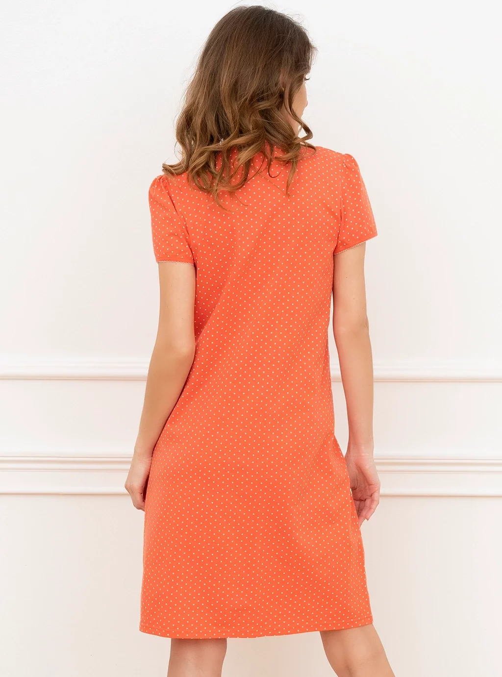 Das orangefarbene Umstandsshirt mit kleinen Punkten auf der Falte zeichnet sich durch luftige, zarte Baumwolle aus, die das Stillen in der Nacht erleichtert. Ein zarter elastischer Schnitt unter der Brust ist ein zusätzlicher Vorteil dieses Shirts. Dies ist eine ideale Wahl für schwangere Frauen, die ihre Babyausstattung vorbereiten. Unser Damen-Nachthemd zum Füttern eines Neugeborenen sorgt für Komfort und gesunden Schlaf während der Schwangerschaft und Stillzeit.