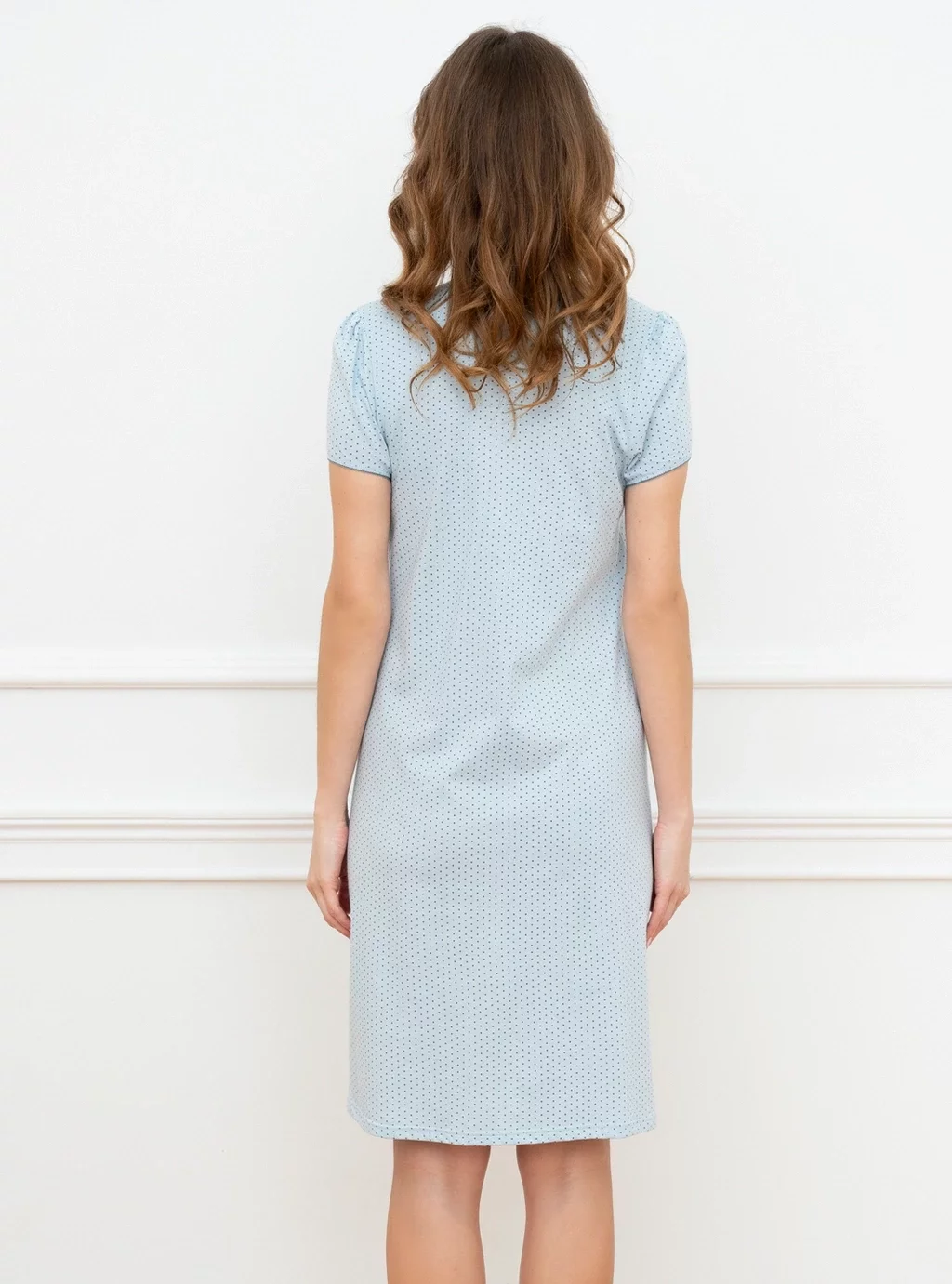 Die zarte blaue Farbe, die kleinen Punkte und die kurzen Ärmel verleihen dem Hemd einen bezaubernden Look. Einfachheit und Eleganz gehen Hand in Hand und schaffen ein Produkt, das nicht nur praktisch, sondern auch stilvoll ist.