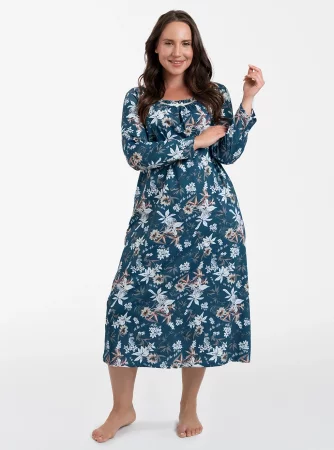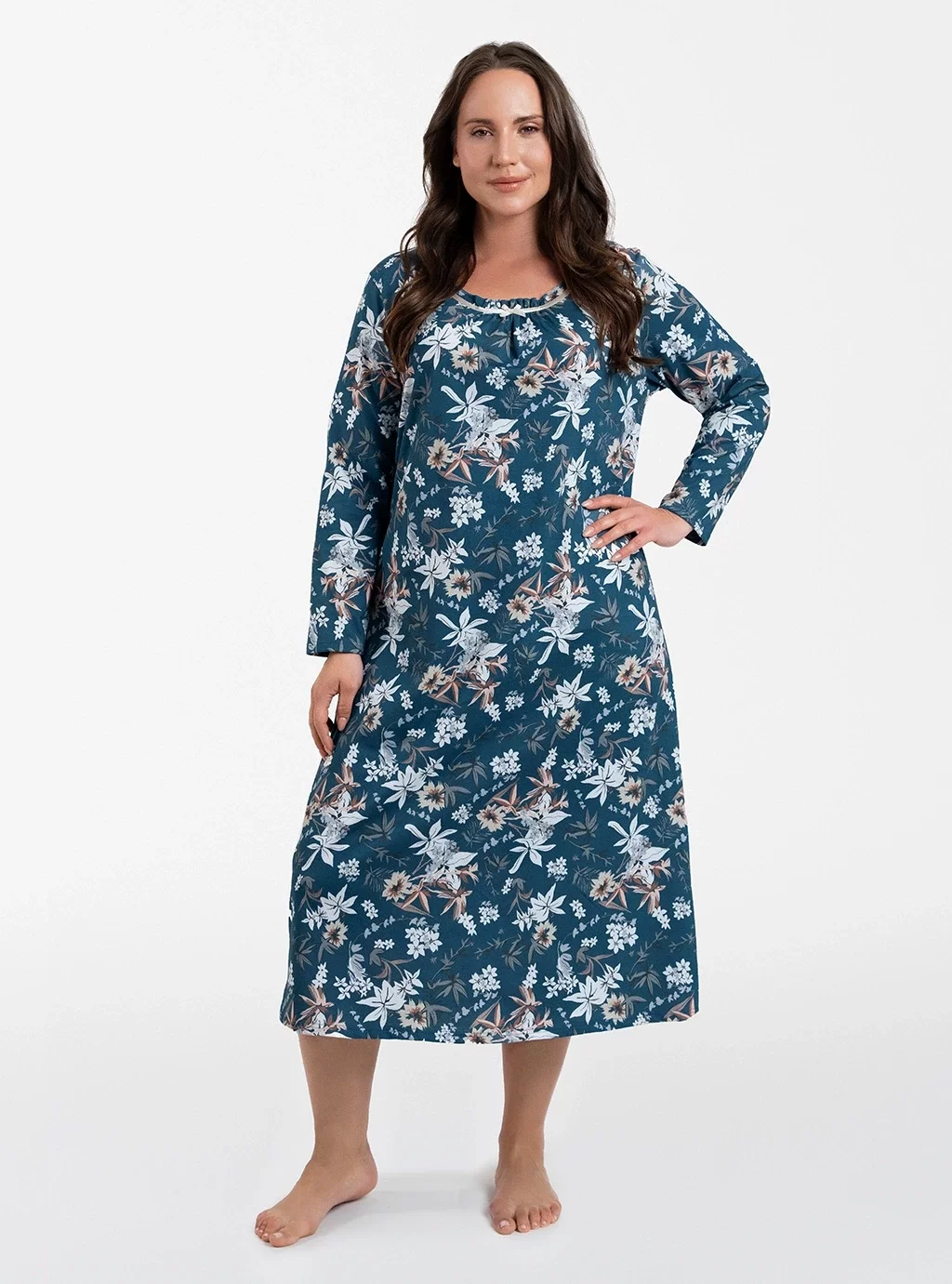 Lange Ärmel und Maxilänge sorgen für Wärme und Komfort, sodass dieses  Modell eine ideale Lösung für kältere Nächte ist. Hochwertiges, weiches Material garantiert ein Gefühl von Zartheit und Freude beim Tragen. Das Blumenmuster auf blauem Grund verleiht dem Damenshirt Frische und romantischen Charme und macht es nicht nur praktisch, sondern auch zu einem sehr charmanten Kleidungsstück.