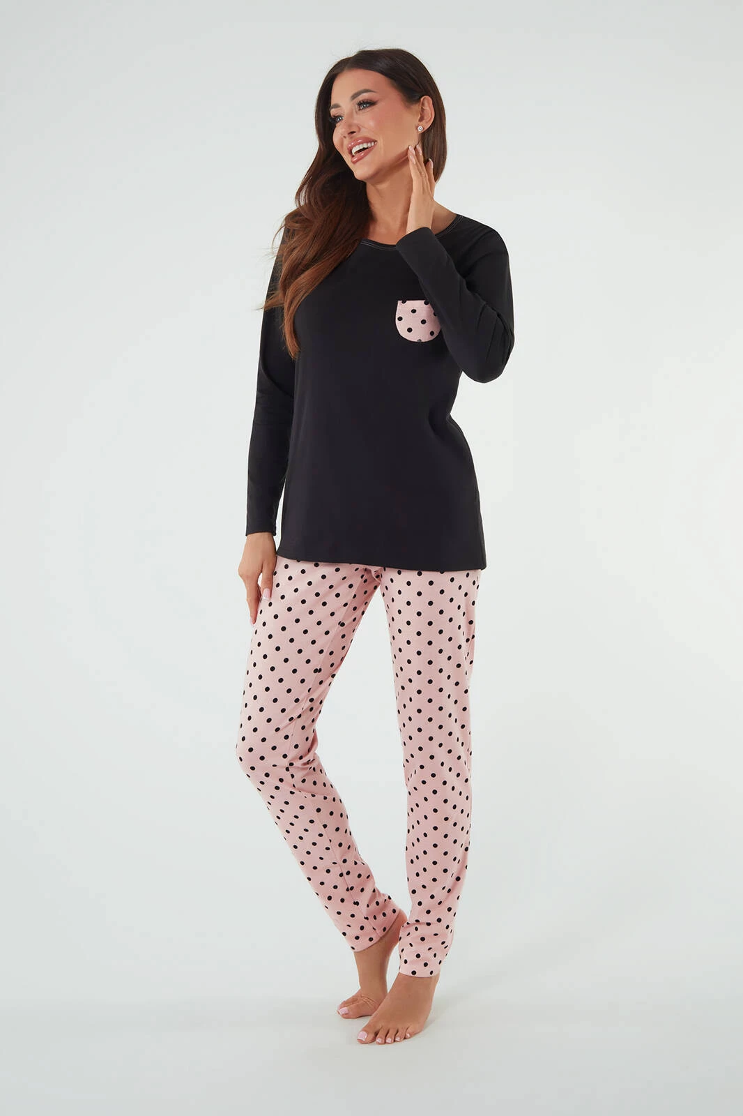 Der Damenpyjama von Buscato besteht aus einer schwarzen Bluse mit Ziertasche, langen Ärmeln und einer langen rosa Hose mit schwarzen Punkten. Dieses Set ist ein elegantes und komfortables Angebot für den Abend für anspruchsvolle Frauen.