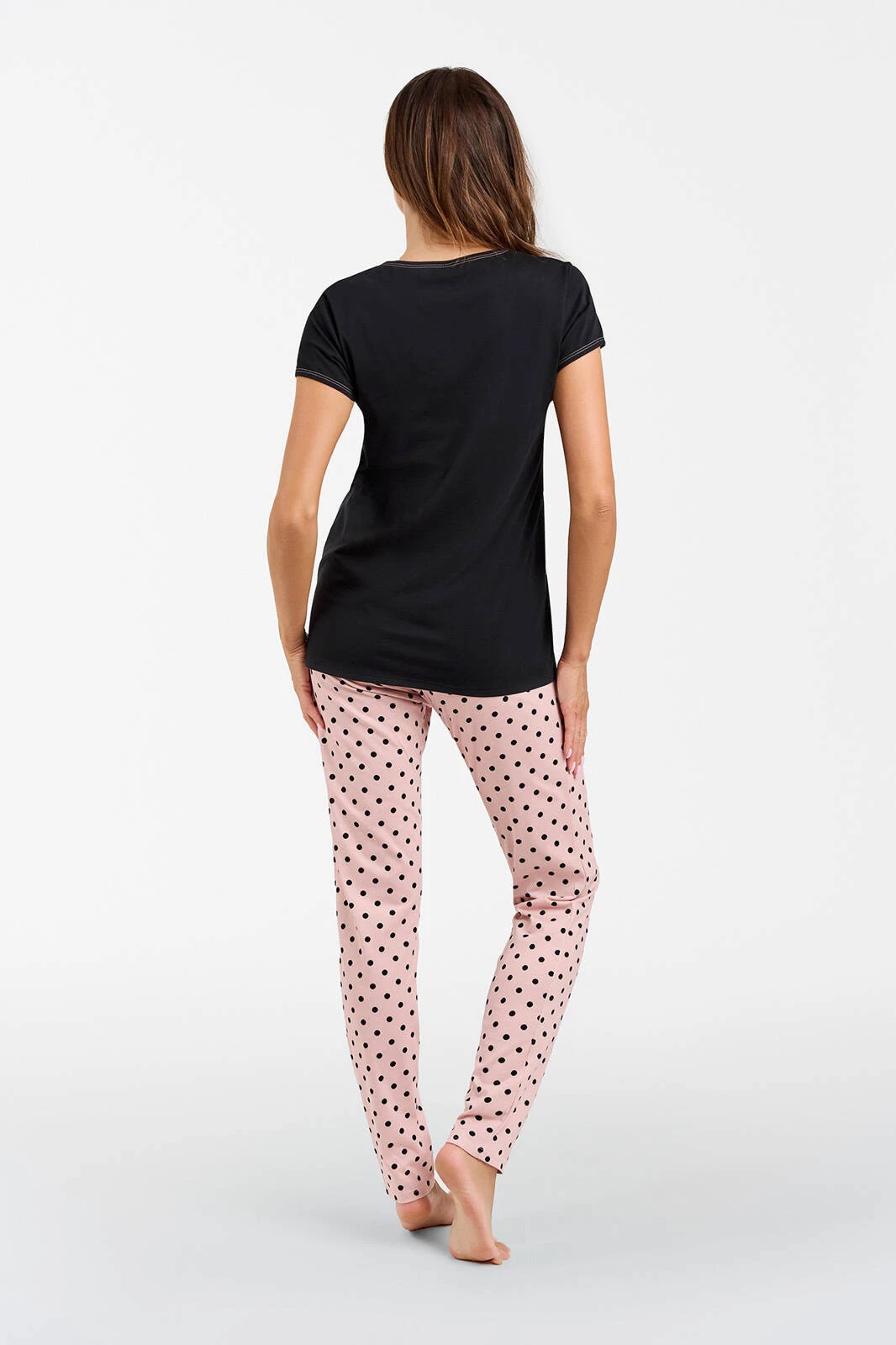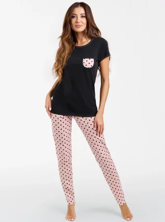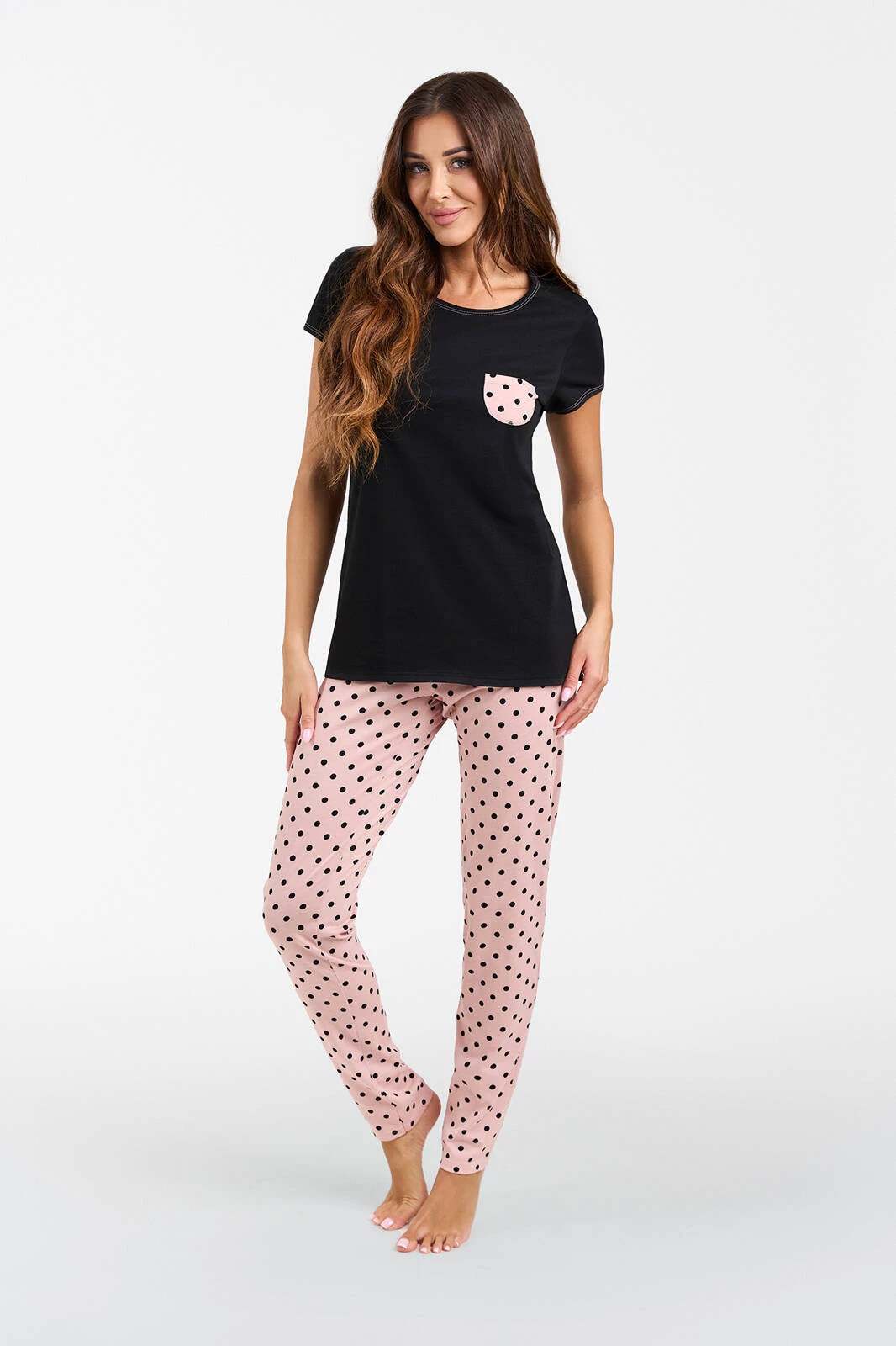 Der Buscato-Pyjama zeichnet sich durch einen klassischen Schnitt mit modernem Touch aus. Der obere schwarze Teil hat kurze Ärmel und einen zarten Ausschnitt sowie eine rosafarbene Ziertasche auf der Vorderseite, die dem Ganzen einen dezenten Charme verleiht. Lange rosa Hosen zeichnen sich durch einen Aufdruck mit schwarzen Punkten aus. Die Hosen sind weich und warm und eignen sich daher perfekt für Herbst- und Winternächte. Das gesamte Set besteht aus weicher, hautfreundlicher Baumwolle, was den Buscato-Pyjama luftig und langlebig macht. Der Baumwollstoff ist pflegeleicht und gewährleistet eine langfristige Nutzung ohne Qualitätsverlust.