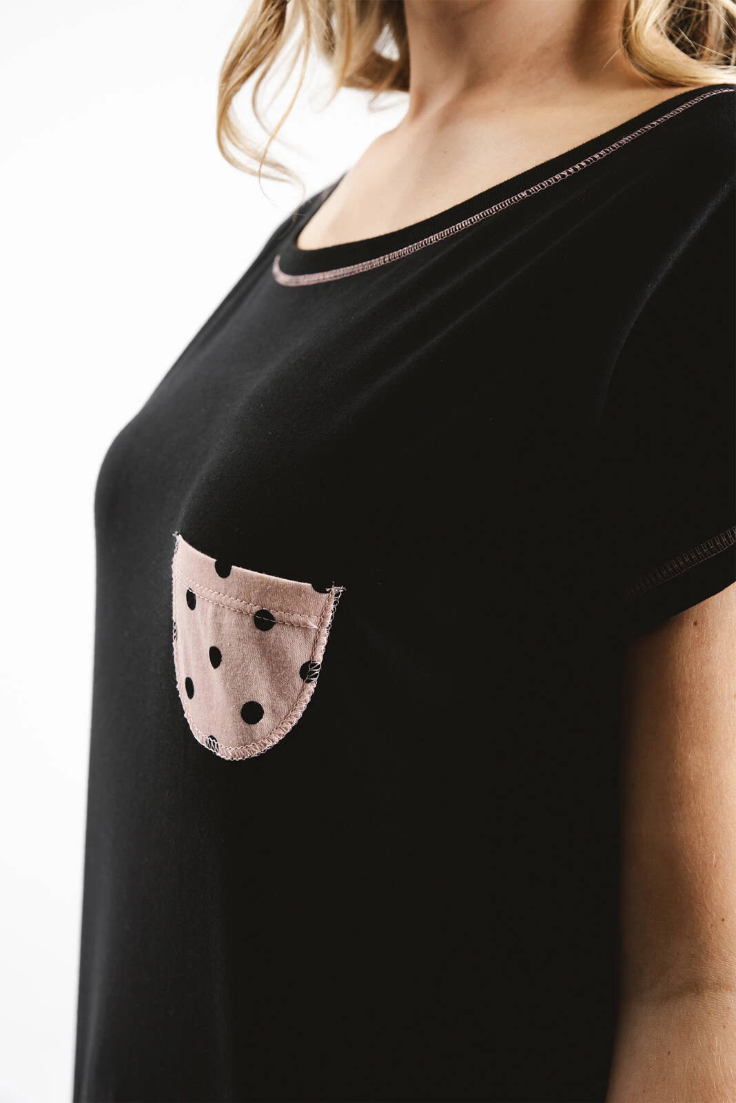 Modisches Design: Der Pyjama zeichnet sich durch einen zeitlosen Stil aus, der Funktionalität mit Ästhetik verbindet. Der obere Teil des Pyjamas hat einen U-Boot-Ausschnitt, der mit einer kontrastierenden rosa Naht verziert ist, was dem Ganzen Eleganz und subtilen Charme verleiht. Kurze Shorts mit niedlichen Punkten bieten völlige Bewegungsfreiheit und sorgen für Stil.