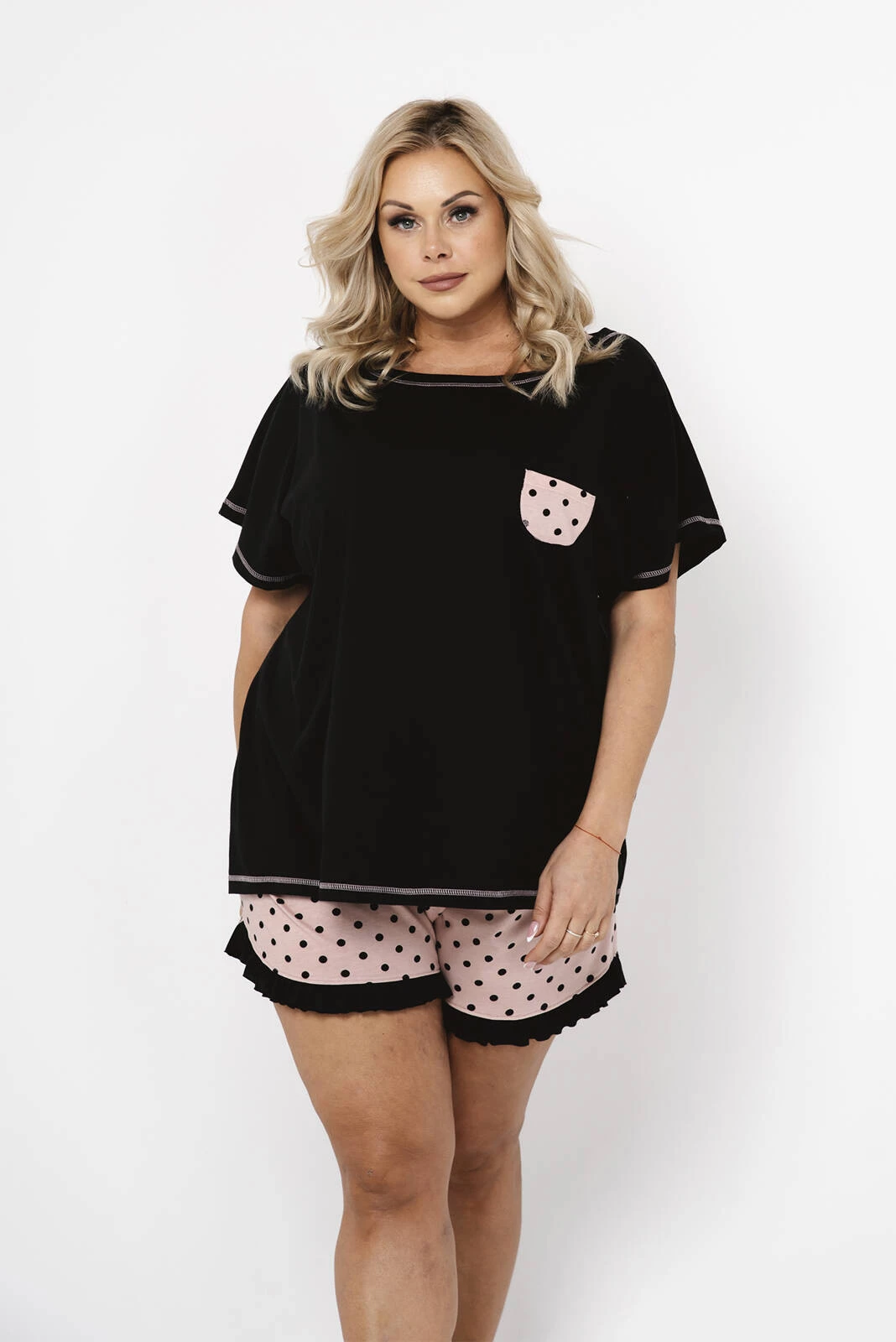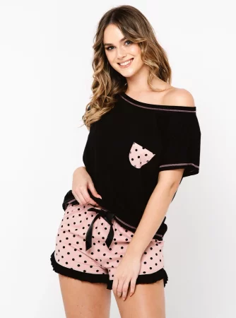 Entdecken Sie den Buscato-Damenpyjama mit kurzen Ärmeln und kurzen Shorts in Rosa mit schwarzen Punkten, perfekt für warme Nächte und Morgen. In einer wunderschönen Kombination aus Schwarz und Rosa im Retro-Stil vereint dieser einzigartige Pyjama Eleganz und Komfort und sorgt für einen stilvollen Look und Tragekomfort.