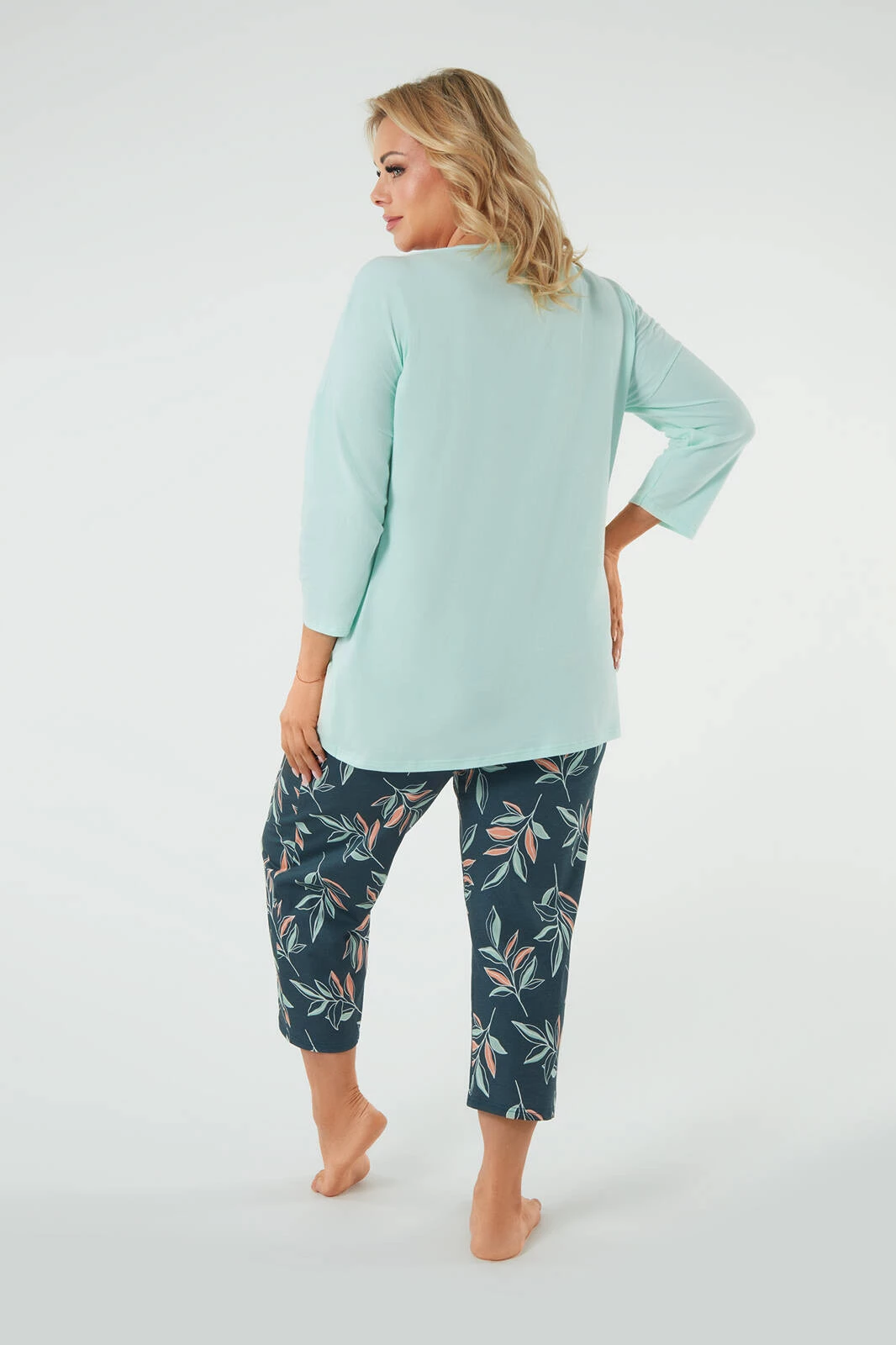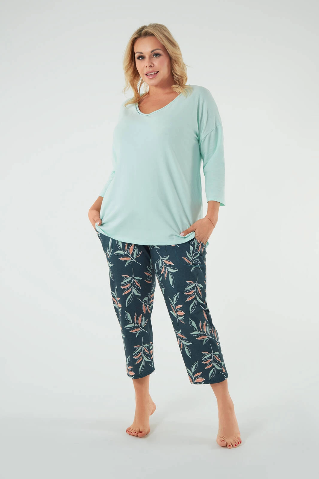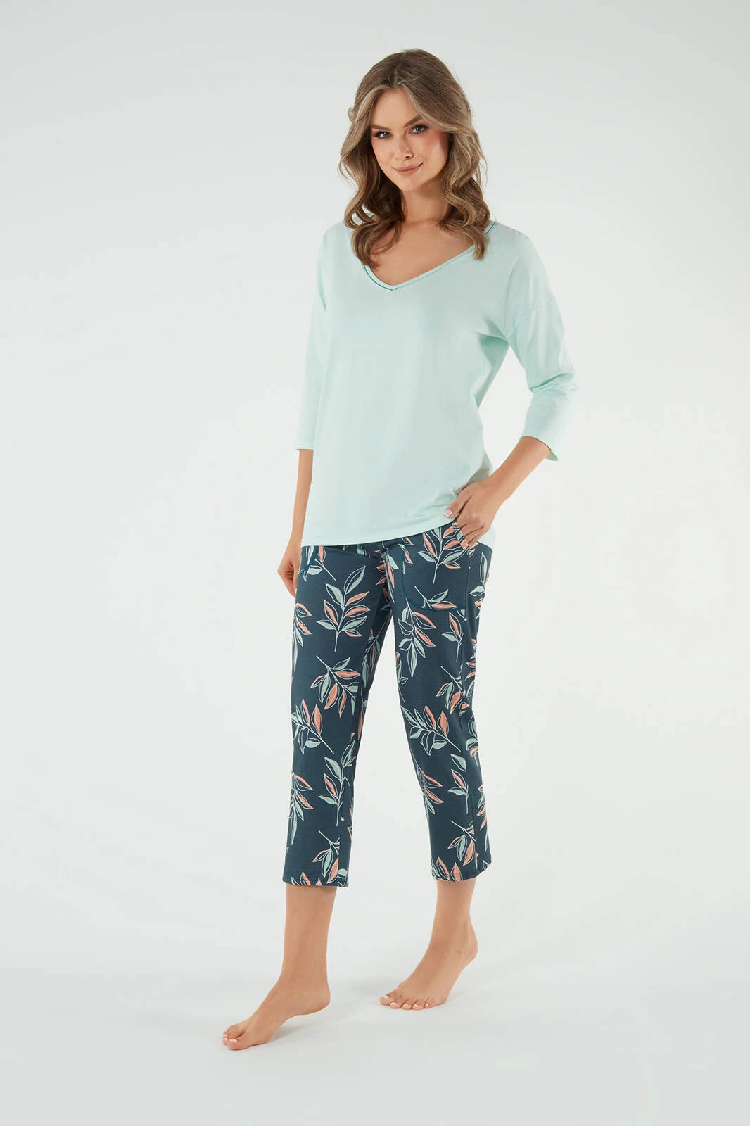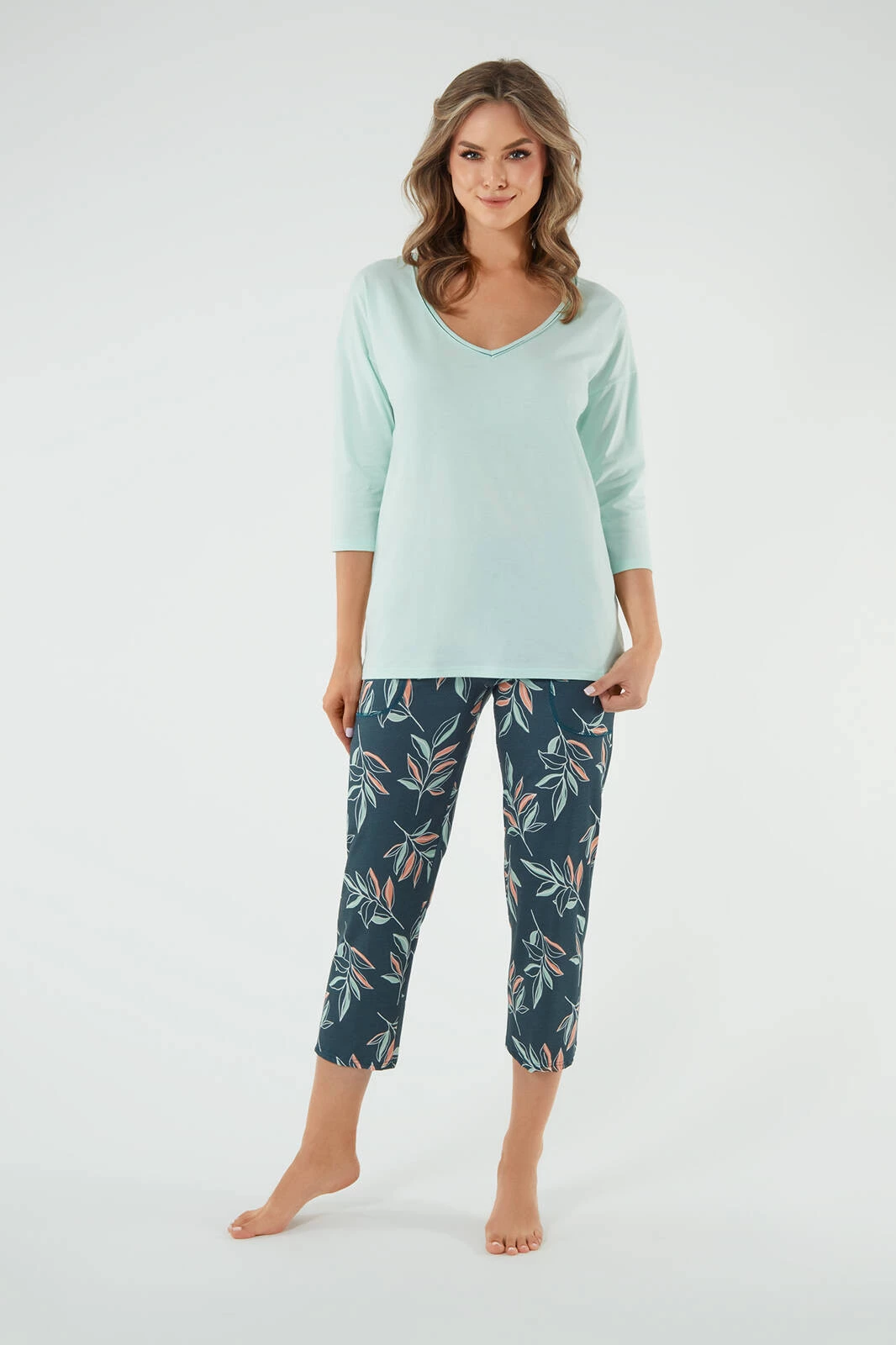Der Damenpyjama von Julietta in der Farbe Pistazien ist ein stilvolles und bequemes Set für eine modebewusste Frau. Es besteht aus einem T-Shirt mit 3/4-Ärmeln und V-Ausschnitt und einer weichen 7/8-Hose mit Taschen für Kleinigkeiten. Das perfekte zeitlose Set, das Komfort und Bewegungsfreiheit bietet. Die Bluse hat einen ausgeprägten V-förmigen Saum und die Hose ist mit einem Aufdruck aus Zweigen auf grünem Hintergrund verziert, der der gesamten Komposition Frische verleiht. Es besteht aus 100 % Baumwolle und bietet Komfort und Atmungsaktivität, ideal besonders nachts. Dieses einzigartige Set wurde in Polen hergestellt und garantiert hohe Qualität und Liebe zum Detail.