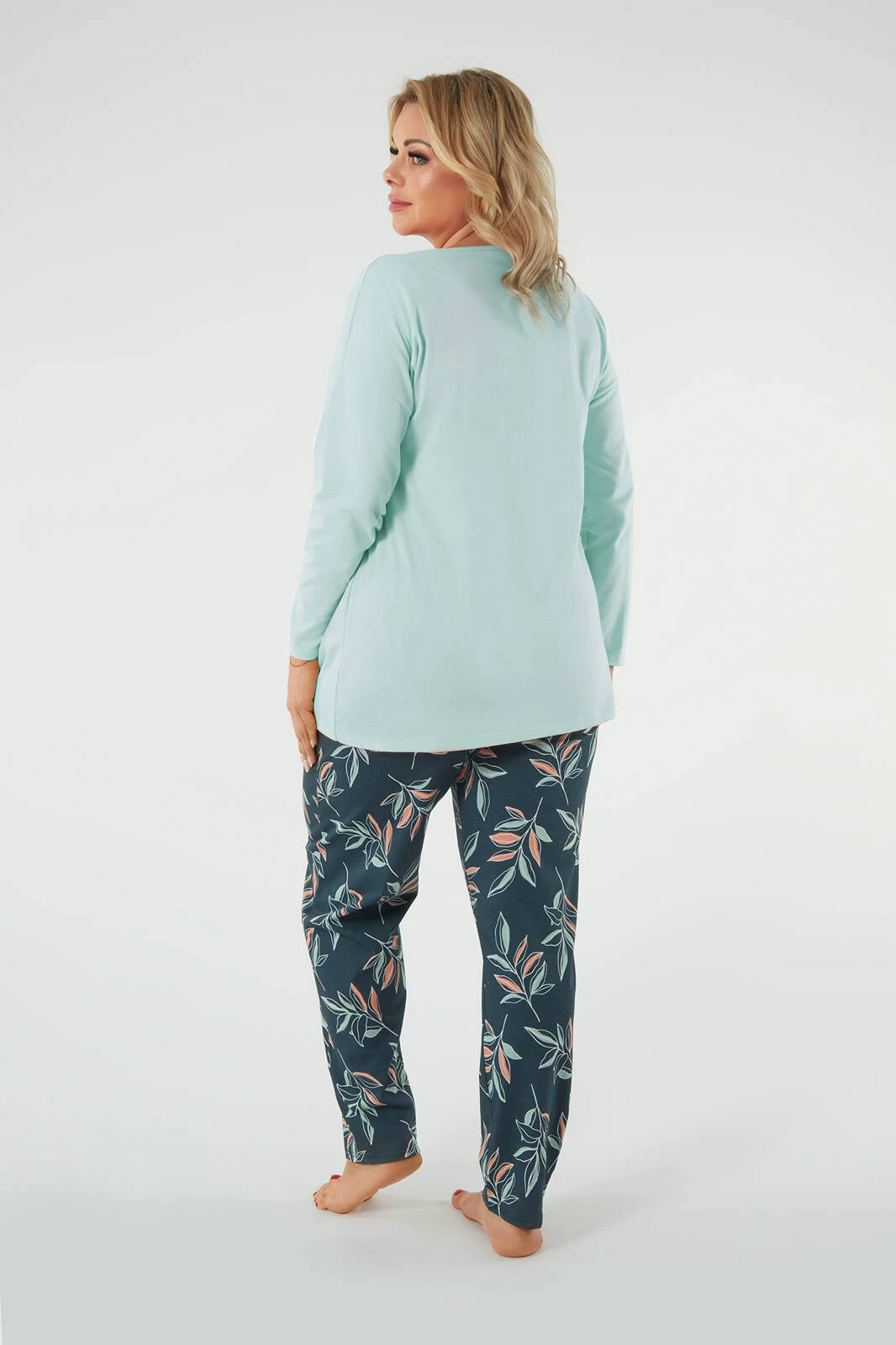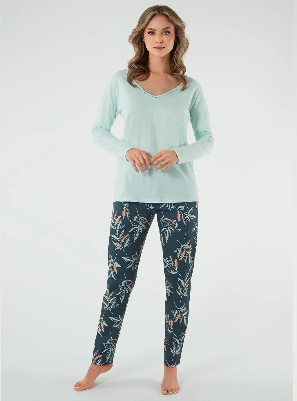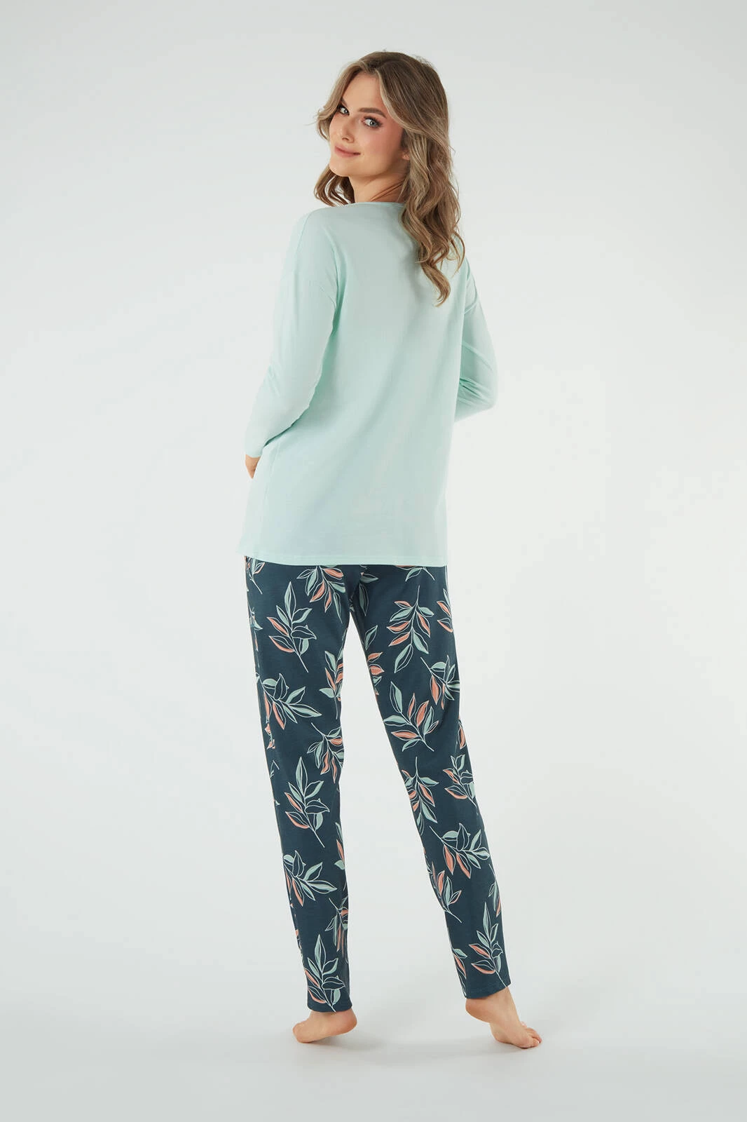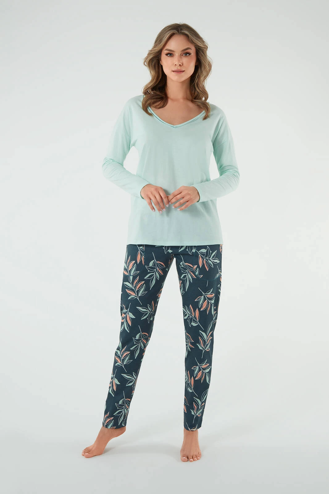 Julietta Damen-Langarmpyjama. lange Hose Pistazie/Druck