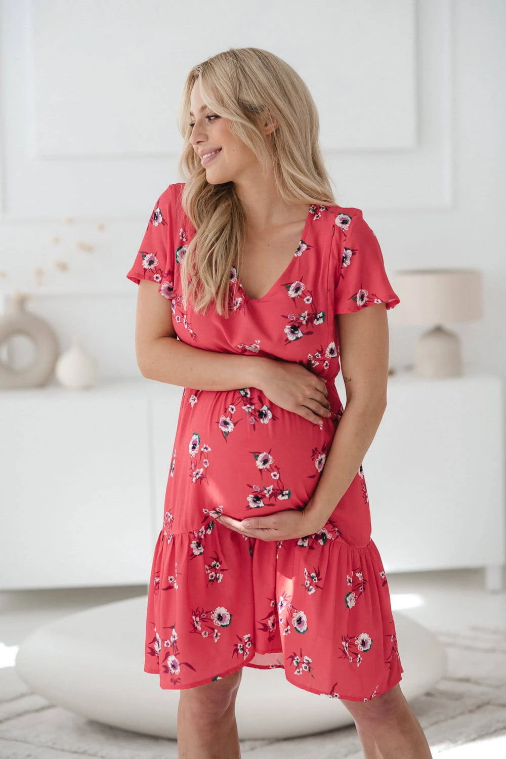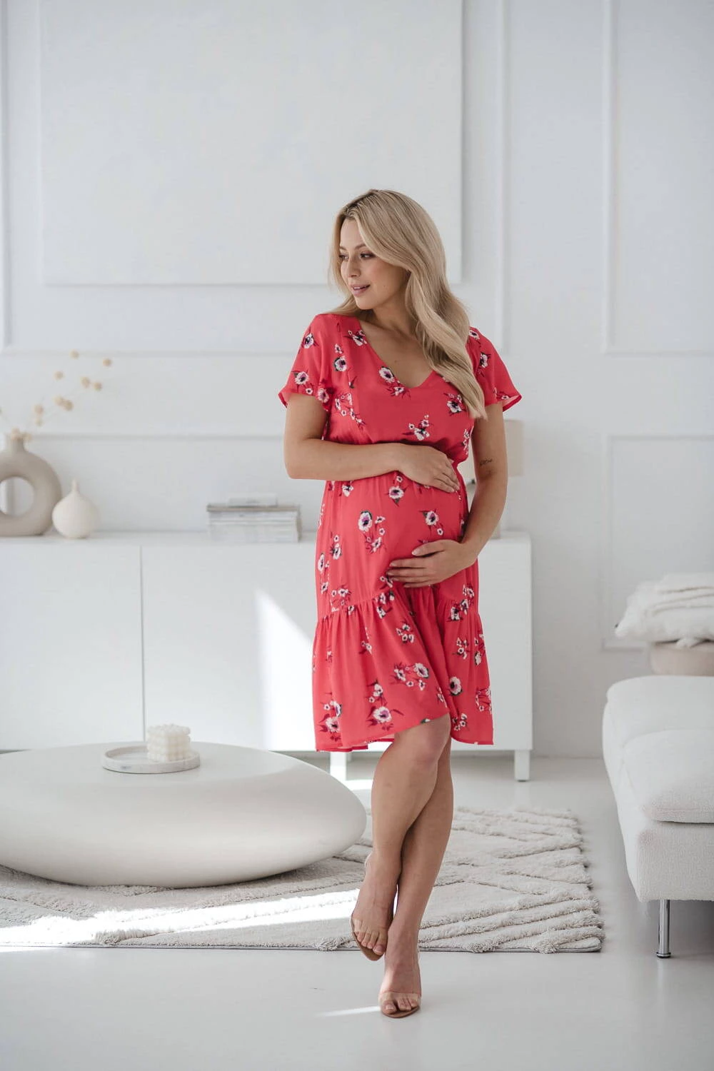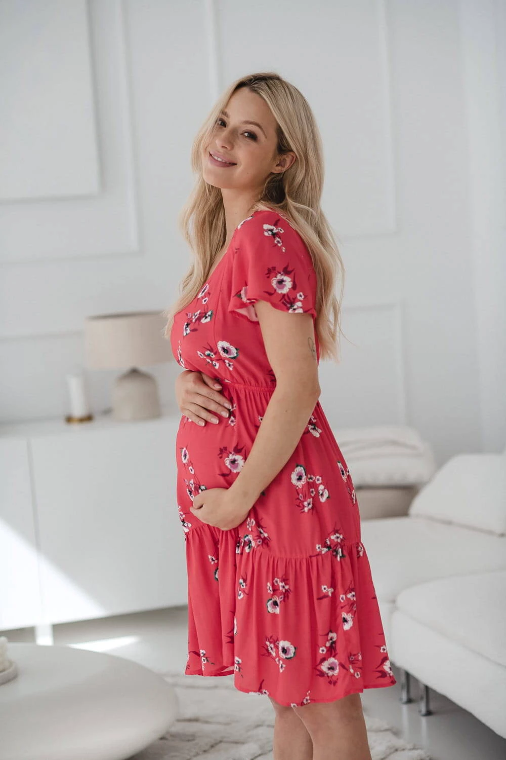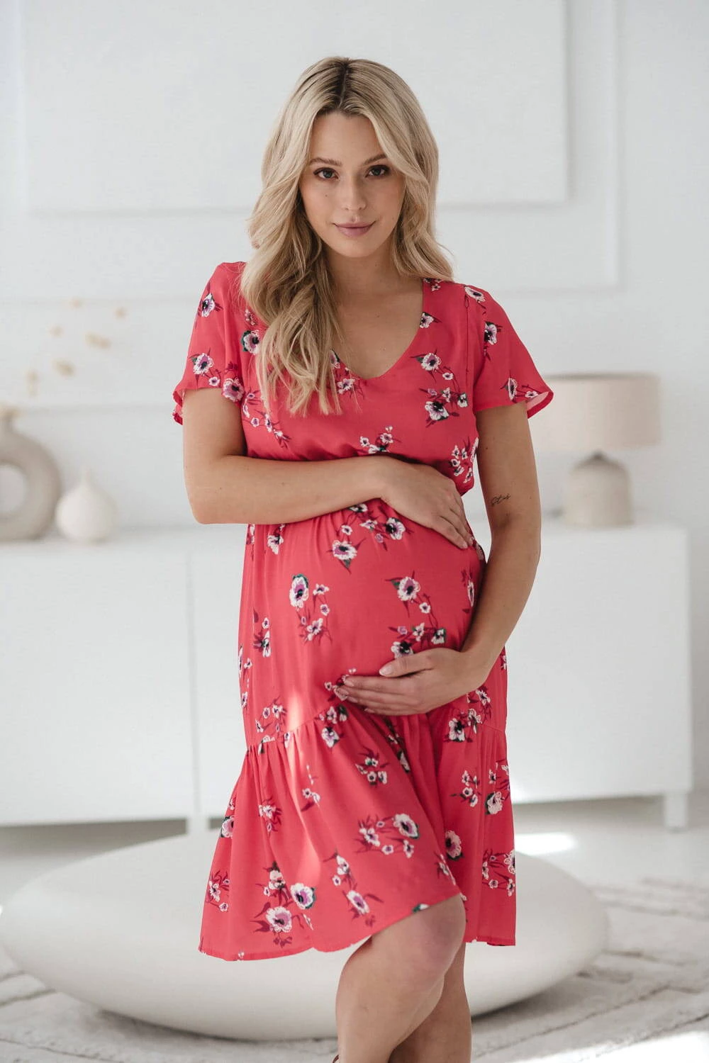 Das korallefarbene Still- und Schwangerschaftskleid Lovely Dress mit kurzen Ärmeln ist die perfekte Wahl für Sommertage und sorgt für Komfort und Stil in jeder Phase der Mutterschaft. Das Kleid für Mütter eignet sich dank versteckter Reißverschlüsse und modisch ausgestellter Ärmel sowohl für einen schwangeren Bauch als auch für bequemes, diskretes Stillen. Dank des elastischen Bandes passt es sich perfekt an Ihre sich verändernde Figur an und sorgt so für Komfort sowohl während der Schwangerschaft als auch nach der Geburt und beim Stillen als frischgebackene Mutter. Ein Kleid für stillende Mütter aus 100 % Viskose höchster Qualität sorgt für Leichtigkeit und Tragekomfort. Nach dem Ende der Stillzeit können Sie diese einzigartigen Umstandskleider als gewöhnliches, elegantes Outfit tragen. Der ausgestellte Boden mit Rüschen sorgt für Leichtigkeit und Charme. Das Korallenkleid ist ein polnisches Produkt, das mit Liebe zum Detail genäht wird, was eine hohe Verarbeitungsqualität gewährleistet.