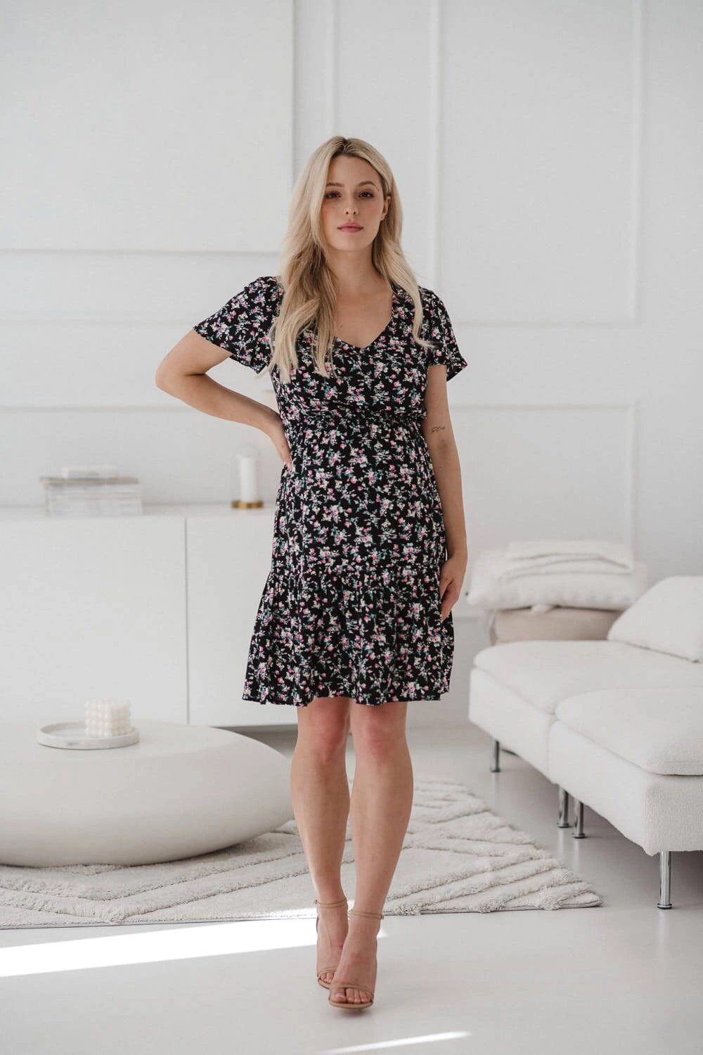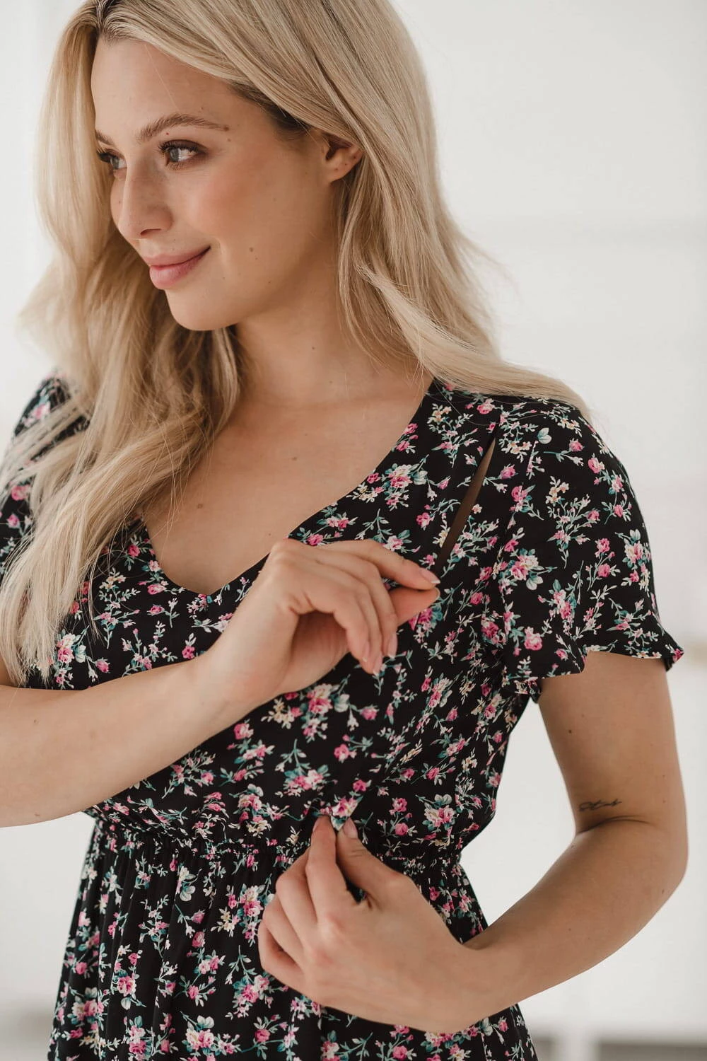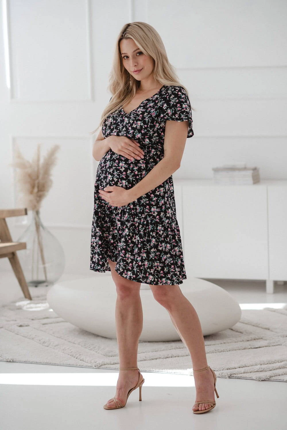Schönes Umstands- und Stillkleid mit kurzen Ärmeln und Rosen