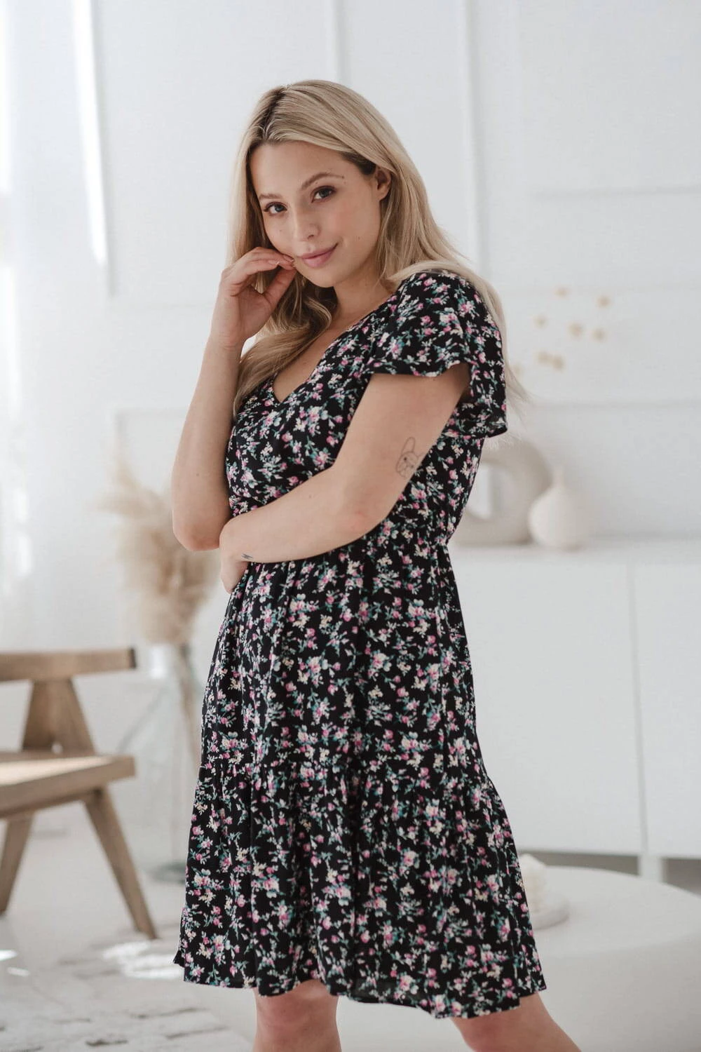 Das schöne Still- und Schwangerschaftskleid mit kurzen Ärmeln und Rosenmuster ist die perfekte Wahl für Sommertage und sorgt in jeder Phase der Mutterschaft für Komfort und Stil. Das Kleid für Mütter eignet sich dank versteckter Reißverschlüsse und modisch ausgestellter Ärmel sowohl für einen schwangeren Bauch als auch für bequemes, diskretes Stillen. Dank des elastischen Bandes passt es sich perfekt an Ihre sich verändernde Figur an und sorgt so für Komfort sowohl während der Schwangerschaft als auch nach der Geburt und beim Stillen als frischgebackene Mutter. Ein Kleid für stillende Mütter aus 100 % Viskose höchster Qualität sorgt für Leichtigkeit und Tragekomfort. Nach dem Ende der Stillzeit können Sie diese einzigartigen Umstandskleider als gewöhnliches, elegantes Outfit tragen. Der ausgestellte Boden mit Rüschen sorgt für Leichtigkeit und Charme. Das Kleid ist ein polnisches Produkt, das mit Liebe zum Detail genäht wird, was eine hohe Verarbeitungsqualität gewährleistet.