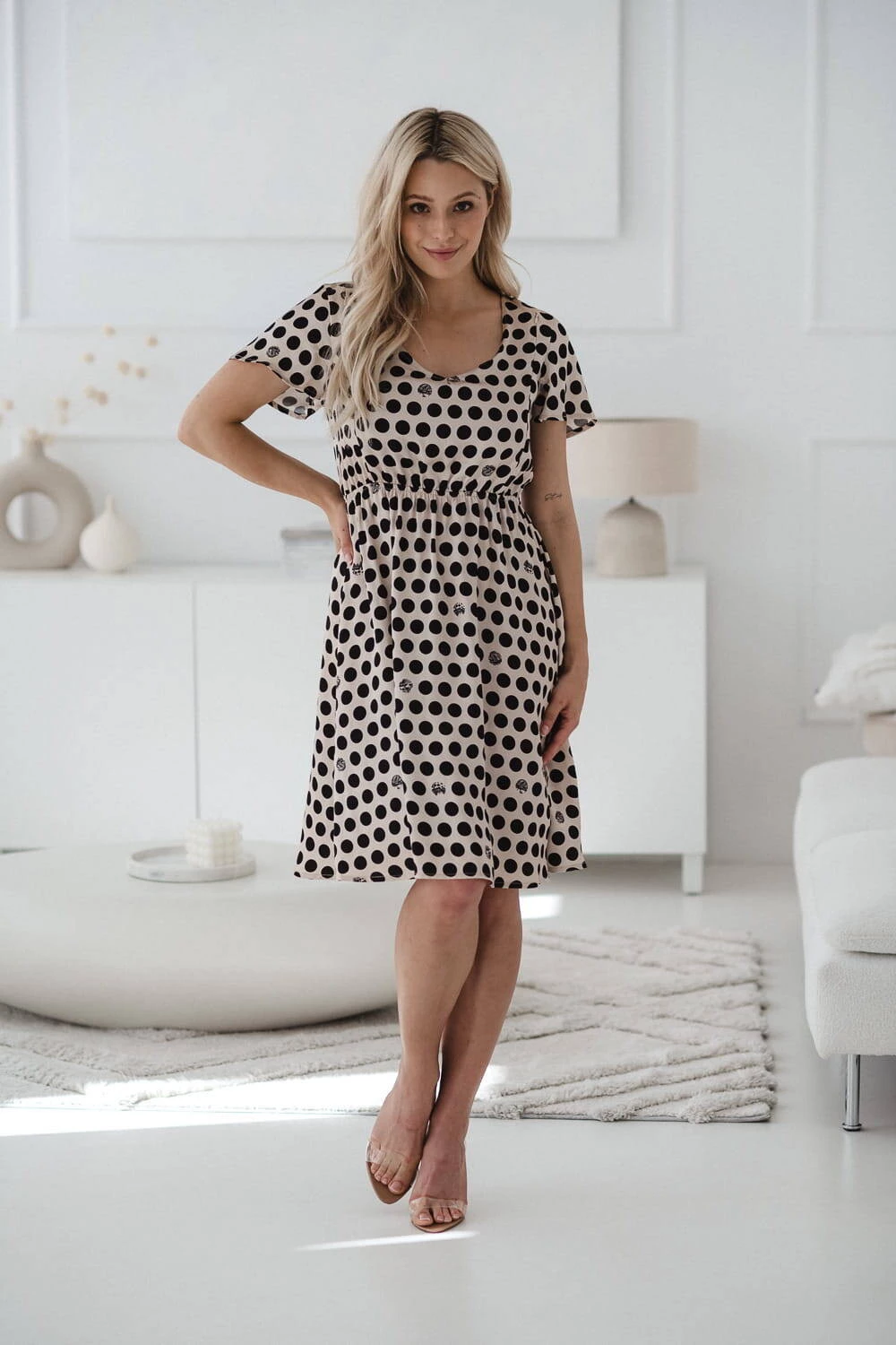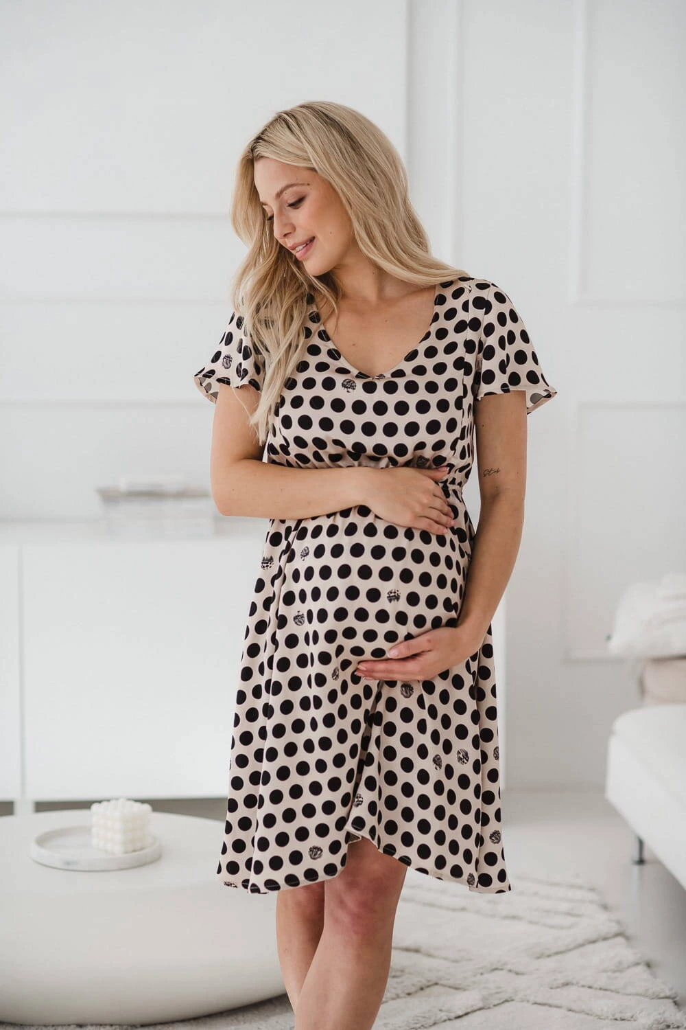 Das gepunktete Kleid hat kurze Ärmel und einen V-Ausschnitt, der die feminine Silhouette betont und für Eleganz sorgt. Das besondere Design des Kleides ermöglicht ein diskretes Stillen nach der Geburt und macht es zu einem praktischen und funktionellen Element der Garderobe jeder jungen Mutter.