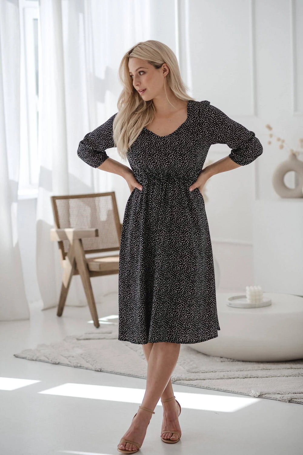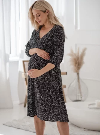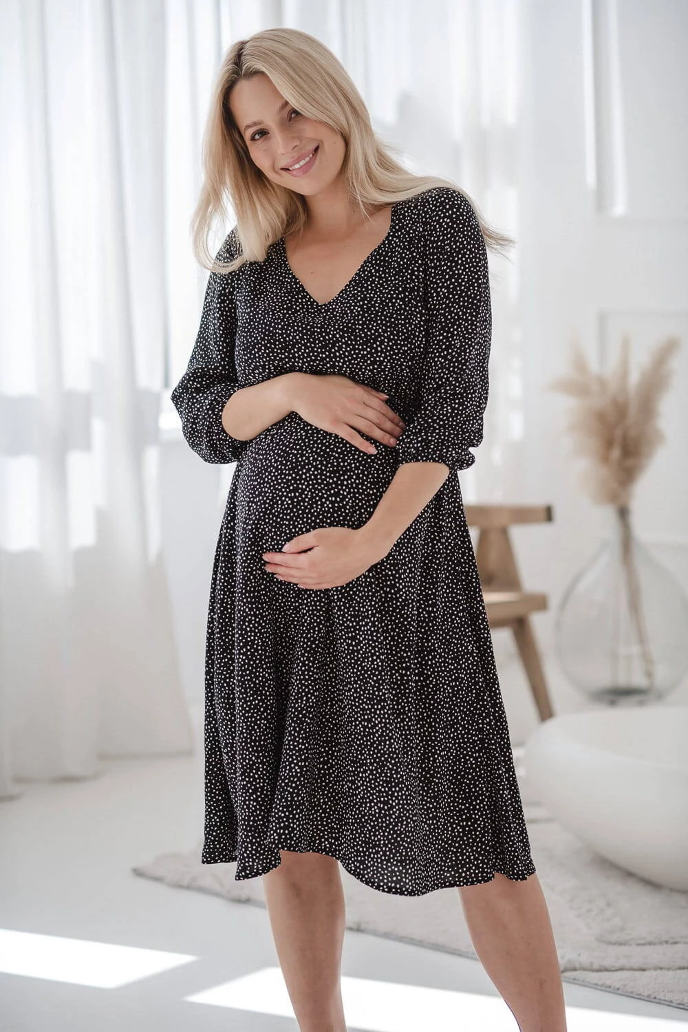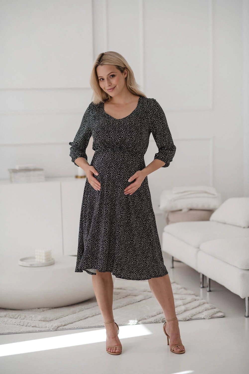 Design : Ein Kleid für stillende Mütter und während der Schwangerschaft zeichnet sich durch einen modischen Schnitt mit Knielänge, einem zarten V-Ausschnitt und 3/4-Ärmeln aus. Ein dezentes Muster mit kleinen Punkten auf schwarzem Hintergrund verleiht Charme und Weiblichkeit und macht das Kleid für verschiedene Anlässe geeignet.