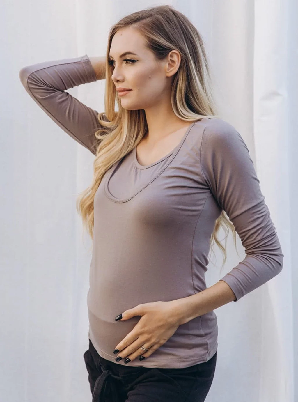 Die Umstands- und Stillbluse Now and Then ist die perfekte Wahl für zukünftige und aktuelle Mütter, die Wert auf die Kombination aus Komfort, Funktionalität und Stil legen. Dank ihres sorgfältigen Designs passt sich diese Bluse ab dem ersten Trimester der Schwangerschaft an die sich verändernde Figur einer Frau an und sorgt für ein bequemes und diskretes Stillen nach der Geburt. Hochwertiges, sehr dehnbares Material zum Nähen einer Langarmbluse für Schwangere und Stillende sorgt für höchsten Tragekomfort. Es fühlt sich weich und angenehm an, wodurch die Bluse selbst für die empfindlichste Haut geeignet ist. Dieses Material passt nicht nur gut, sondern ist auch langlebig und beständig gegen wiederholtes Waschen.