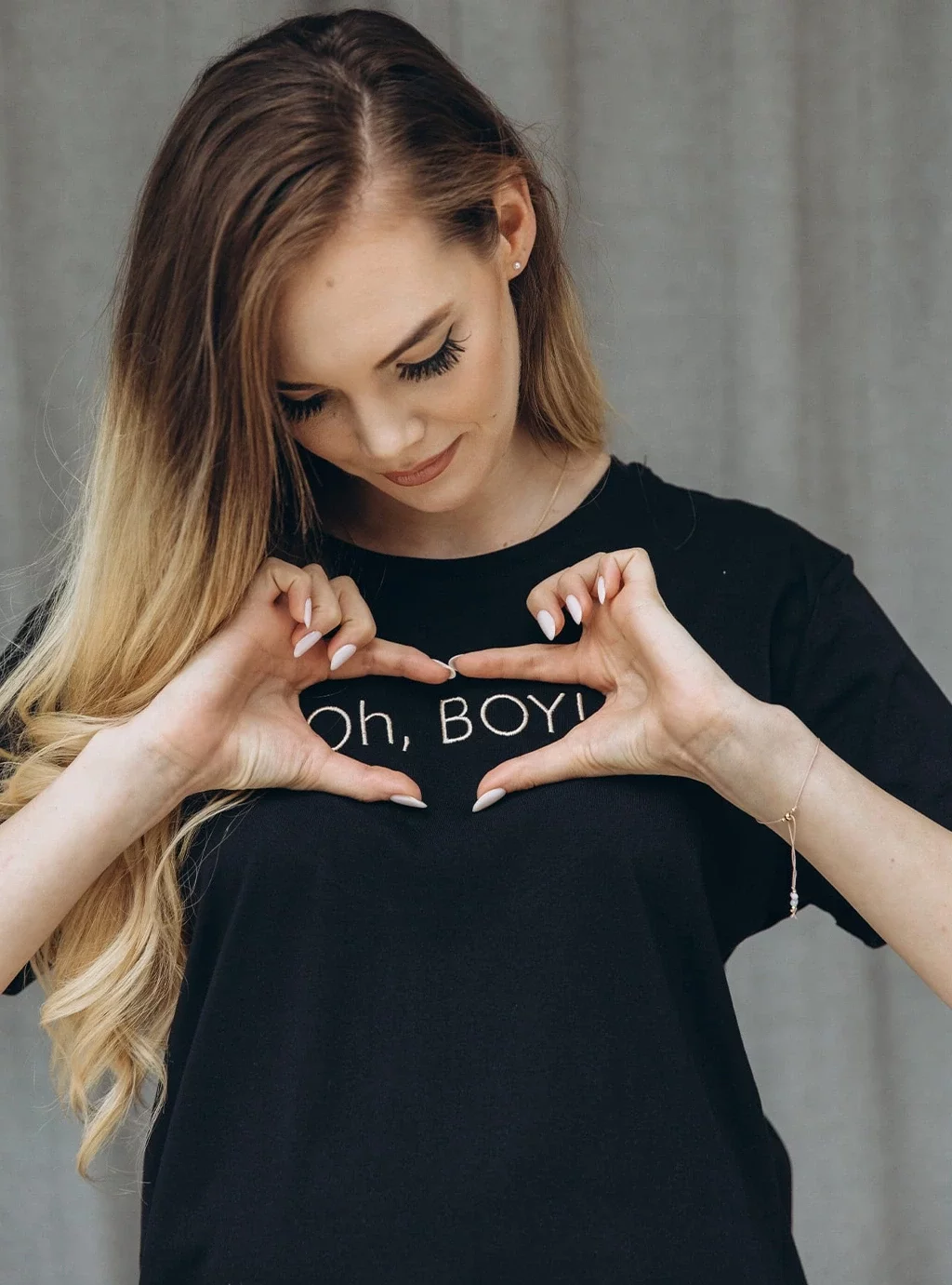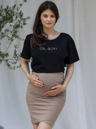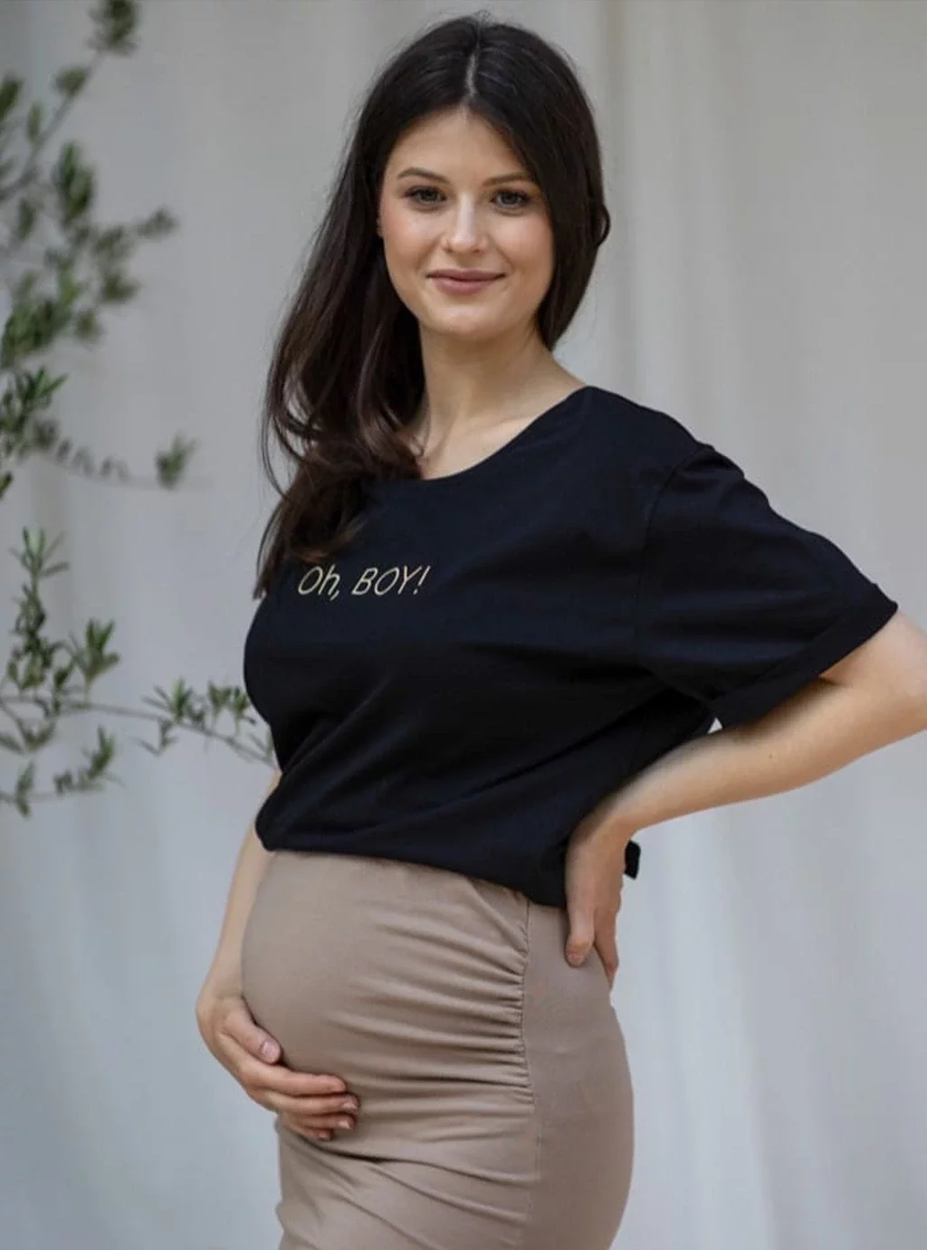 Ein übergroßes Umstands-T-Shirt in Schwarz ist ein perfektes Produkt für zukünftige und junge Mütter, die Wert auf Komfort und Stil legen. Dieses Modell wurde so konzipiert, dass es modisch und langlebig ist, was eine langfristige Nutzung gewährleistet. Die Umstandsbluse mit Schlitz am Rücken wurde in Polen aus hochwertiger, weicher und atmungsaktiver Baumwolle hergestellt, die auch nach Schwangerschaft und Stillzeit Tragekomfort garantiert. Oh, Junge! T-Shirt Übergröße der Marke Latte Mama sorgt für maximalen Komfort während der Schwangerschaft und Stillzeit. Der lockere Schnitt dieses universellen T-Shirts sorgt für Bewegungsfreiheit und eine perfekte Anpassung an Ihre sich verändernde Figur.