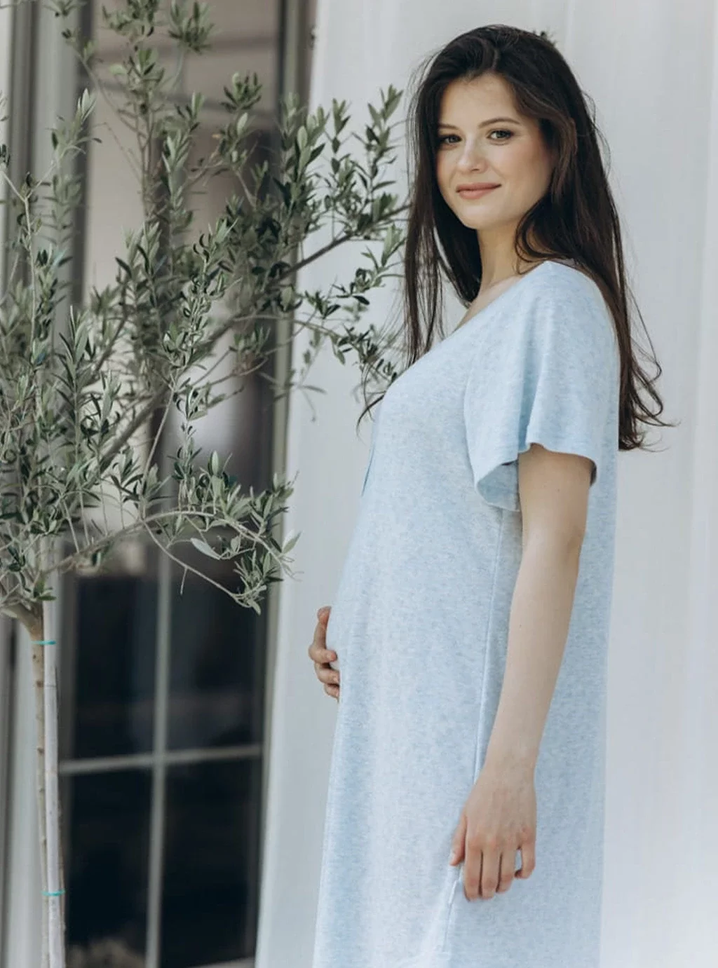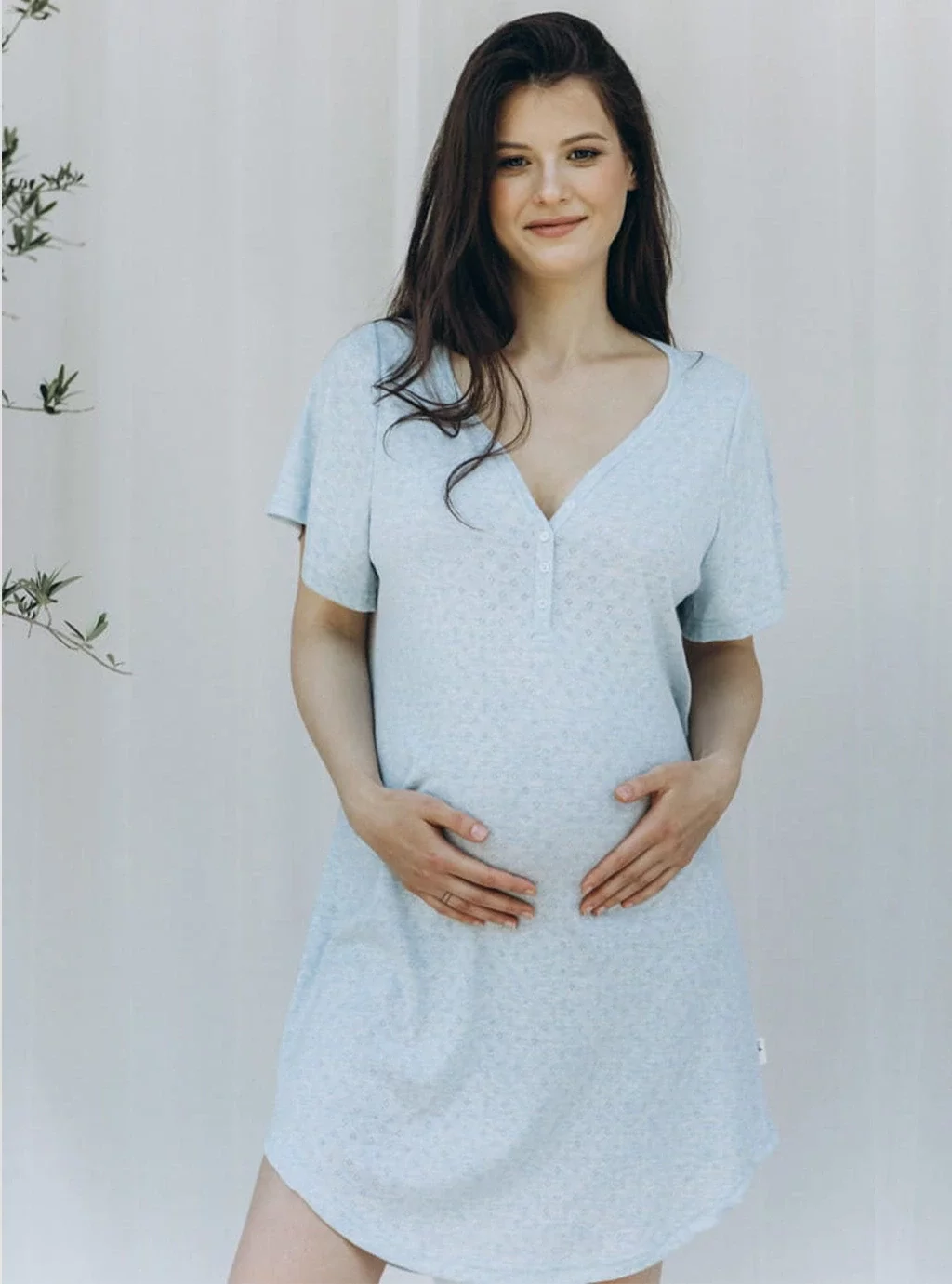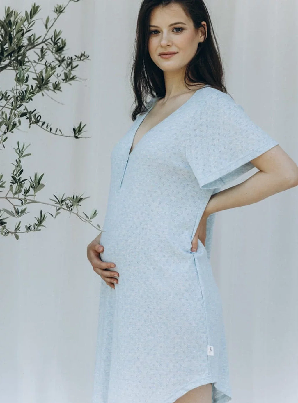 Das blaue Umstandsshirt Goodnight Kiss für Wehen und Stillen ist die perfekte Wahl für werdende Mütter, die Komfort und Funktionalität suchen. Es besteht zu 100 % aus natürlicher Baumwolle und ist äußerst weich und zart. Es sorgt für Komfort während der Schwangerschaft, der Geburt und nach der Geburt des Babys und erleichtert das Stillen. Die durchbrochene Struktur verleiht dezenten Charme und der lockere Schnitt und die Elastizität des Stoffes passen sich perfekt der sich verändernden Silhouette an.