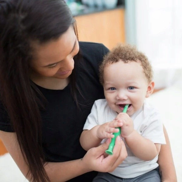 Pamiętaj, aby spłukać szczoteczkę do zębów dla niemowląt ciepłą wodą przed i po każdym użyciu. Dentyści zalecają wyminę szczoteczki do zębów co trzy miesiące. Nie zawiera BPA.