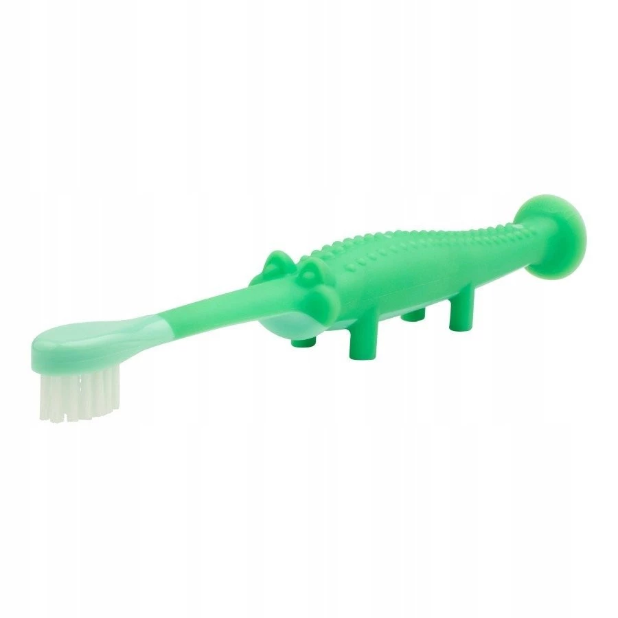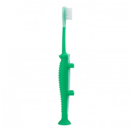 Szczoteczka do zębów dla dzieci jest dopasowana do małych ust, pomaga w rozwoju umiejętności potrzebnych do samodzielnego mycia zębów. Posiada miękkie włosie, dla delikatnego szczotkowania. Nogi krokodyla pomagają małym palcom wygodnie trzymać szczoteczkę. Przyssawka w podstawce utrzymuje szczoteczkę bezpiecznie w pozycji pionowej. Pamiętaj, aby spłukać szczoteczkę ciepłą wodą przed i po każdym użyciu. Dentyści zalecają wymianę co trzy miesiące ze względów higienicznych. Dla dzieci powyżej 12 miesiąca życia