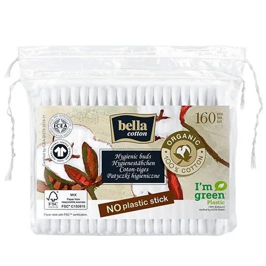 Die Bella Cotton BIO Hygienesticks bestehen aus Papier, das mit Bio-Baumwolle überzogen ist, die auf Feldern angebaut wird, die frei von Pestiziden und chemischen Zusätzen sind. Sie sind eine ideale Wahl für Verbraucher, die umweltfreundliche Produkte suchen. Die Sticks sind in Beuteln aus einer speziellen Folie verpackt, die zu mehr als 90 % aus nachwachsenden Rohstoffen besteht. I'm green™ Polyethylen wird aus Ethanol aus Zuckerrohr hergestellt.
