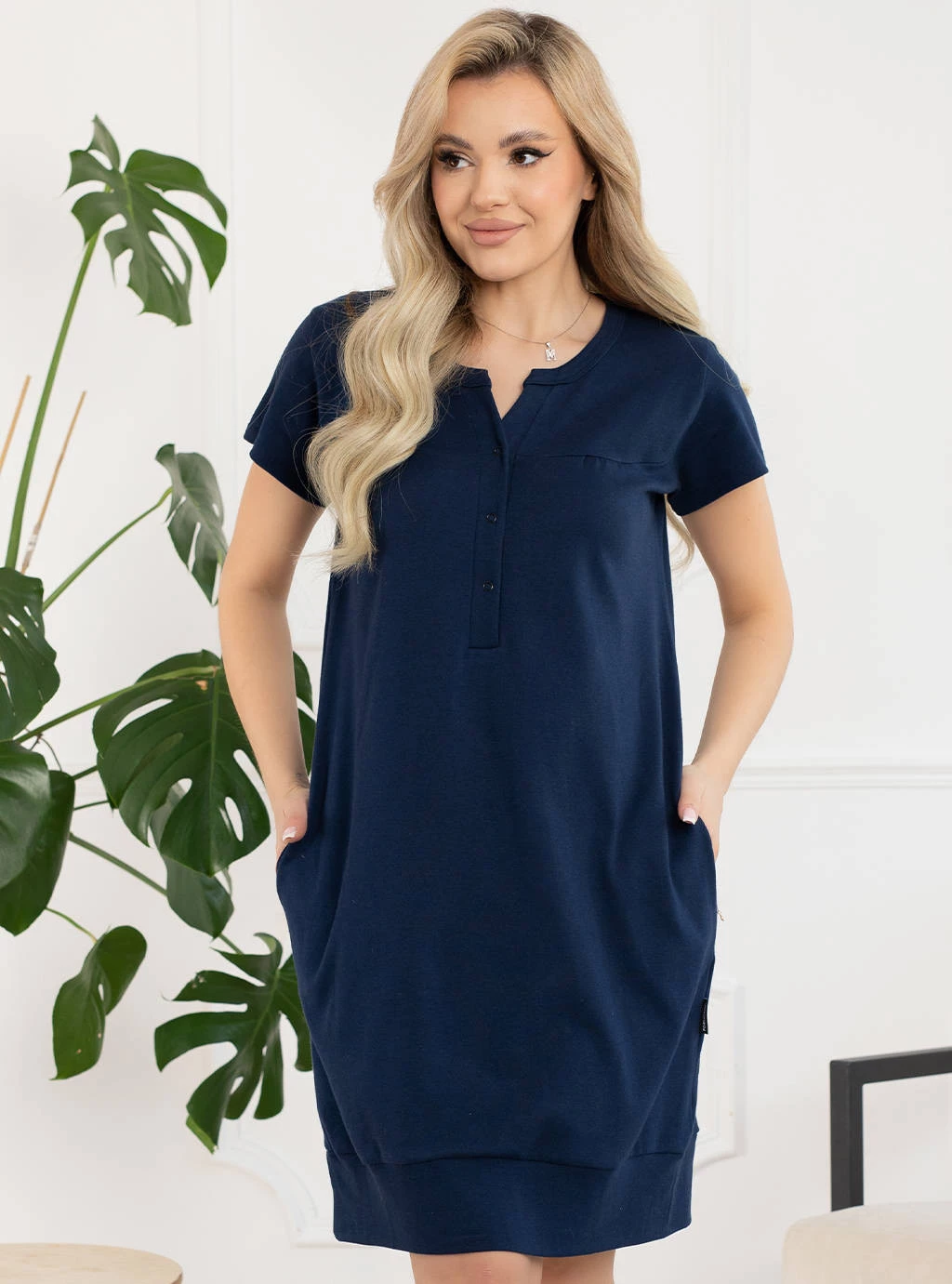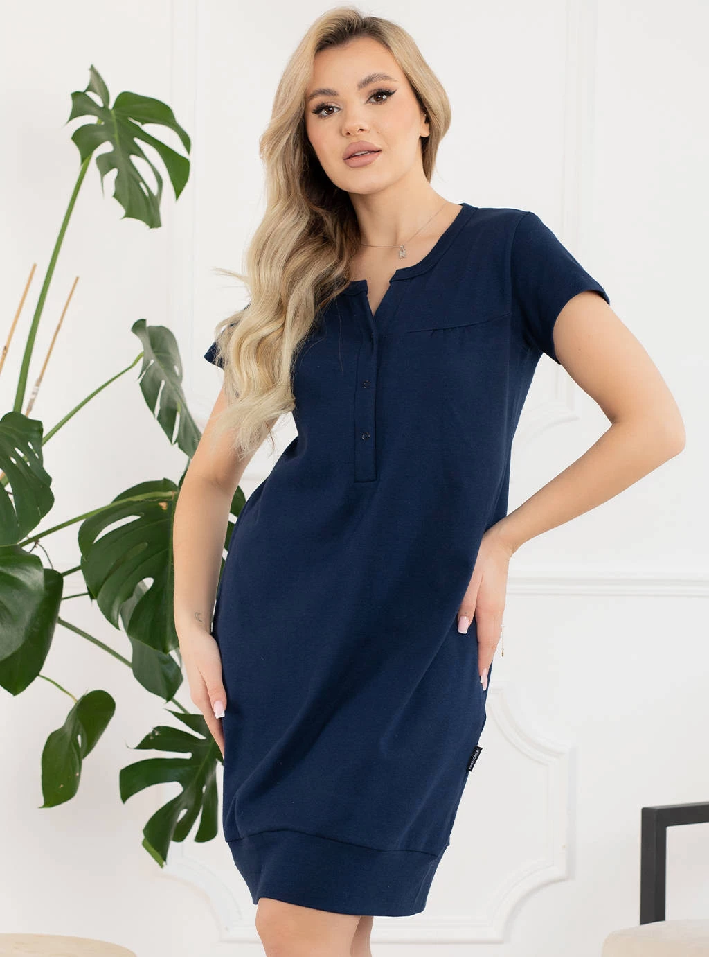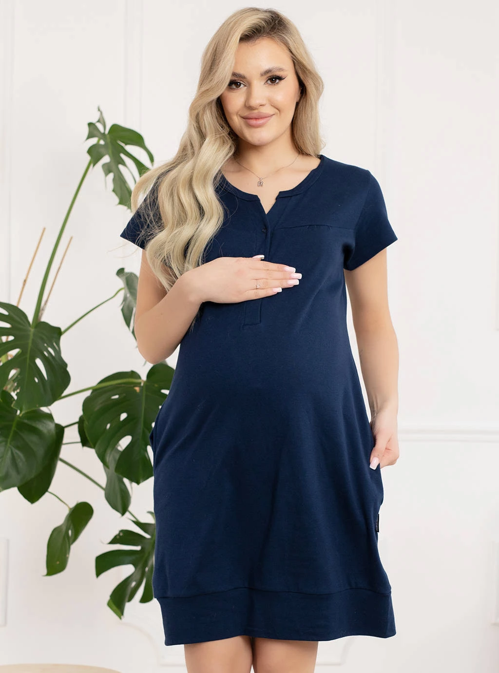Die marineblauen Sunny Nachthemden wurden in Polen von polnischen Herstellern gefertigt. Das Stillshirt wird in der Mitte mit Druckknöpfen geöffnet, das Oberteil ist mit einer bequemen Passe und kleinen Abnähern genäht. Das Unterteil ist mit gleichfarbigen Paspeln eingefasst, was seinen Charme ausmacht und an eine bequeme Tunika mit Bomberschnitt erinnert. Es kann problemlos ein Kleid oder andere Umstandskleidung ersetzen. Ein weiterer Vorteil dieses einzigartigen Still- und Geburtsnachthemdes sind die eingenähten Taschen zur Aufbewahrung Ihrer Schwangerschaftsutensilien.