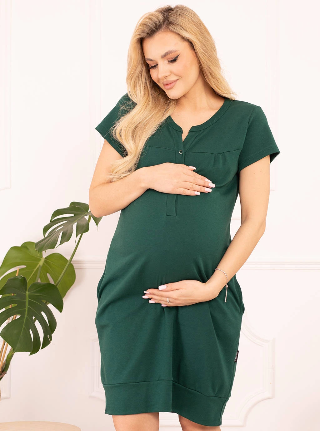 Das grüne Shirt zum Stillen und Gebären ist so konzipiert, dass Sie Ihr Baby bequem und mühelos stillen können. Das Sunny Shirt wird in der Mitte mit Druckknöpfen geschlossen, damit Sie beim Stillen Ihres Kindes schnell an Ihre Brust kommen. Es schmiegt sich perfekt an Ihren wachsenden Bauch an, damit Sie sich so wohl fühlen, wie Sie es jetzt brauchen. Die werdende Mutter, die sich für ein Hemd in Flaschengrün entscheidet, fühlt sich trotzdem attraktiv und feminin, und das Stillen wird nicht peinlich, sondern diskret und einfach sein.