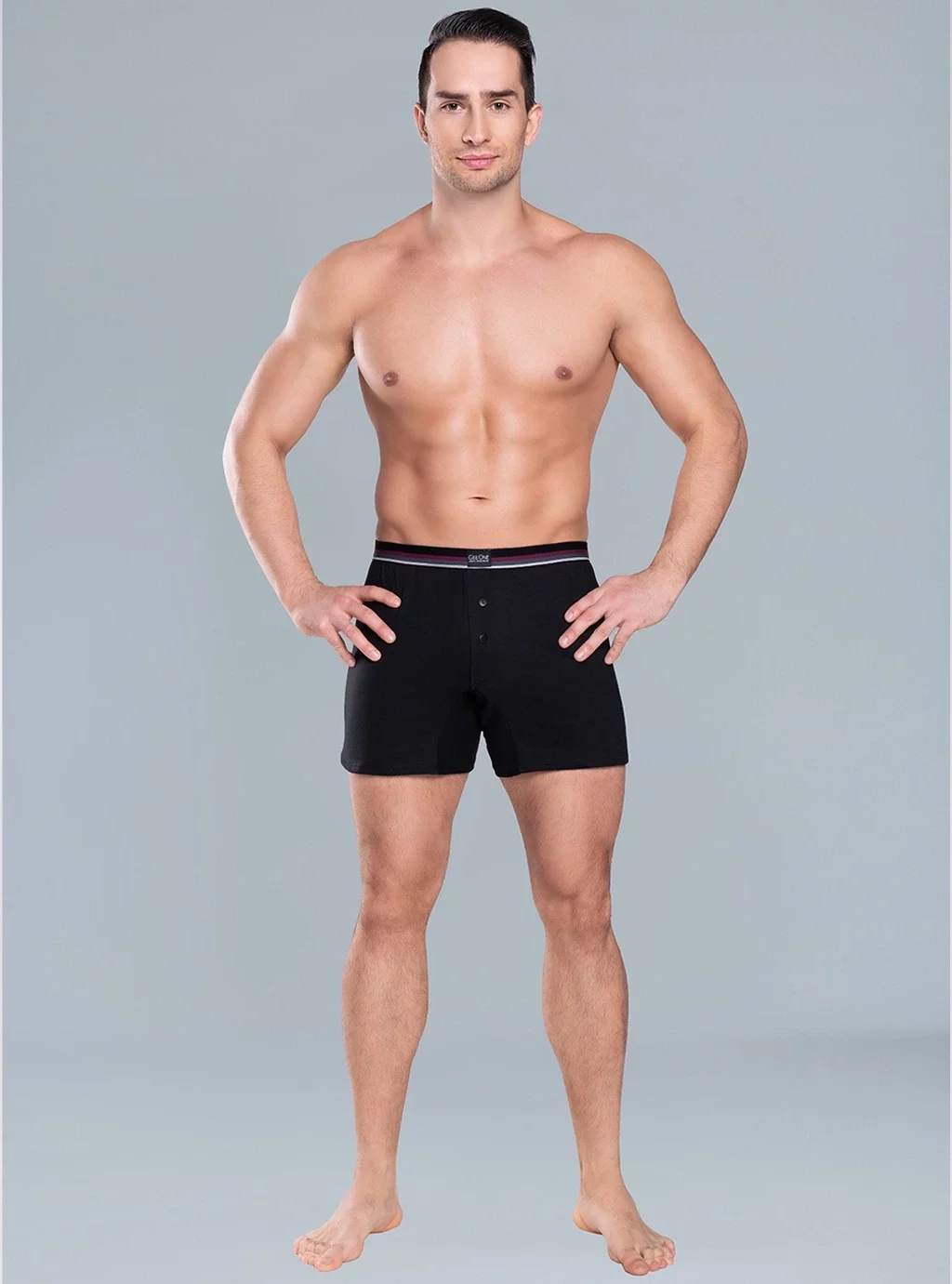 Die Herren-Boxershorts von Logan sind elegante und funktionelle Unterwäsche, die Komfort und modischen Stil vereint. Perfekt für Männer, die Wert auf einen klassischen Look und hohen Tragekomfort legen. Wir präsentieren Ihnen Herren-Boxershorts in der klassischen schwarzen Farbe, die universell und zeitlos ist. Die schwarzen Boxershorts Logan zeichnen sich durch ein schlichtes, minimalistisches Design aus, das durch dezente Details, wie einen elastischen Bund mit zartem, buntem Streifen, unterstrichen wird. Der Gummizug sorgt für eine perfekte Passform an der Figur und setzt gleichzeitig einen modernen Akzent bei den Boxershorts.