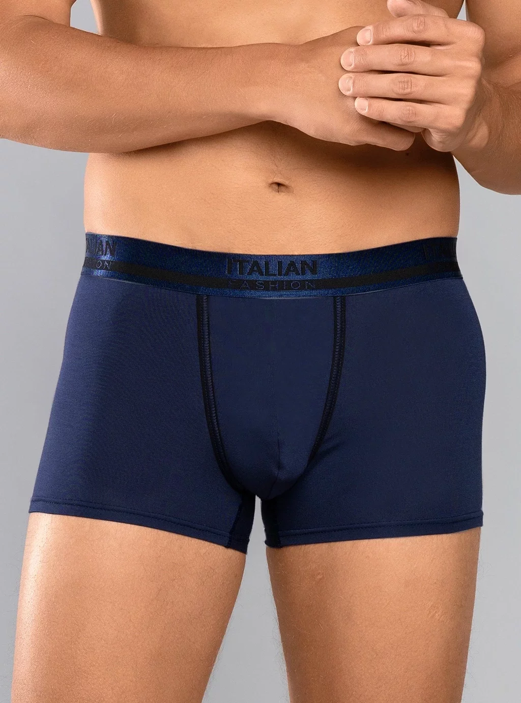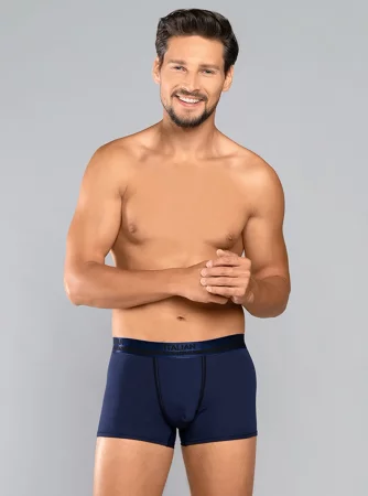 Achten Sie auf die klassische Marineblau-Farbe, die diesem Produkt ein modernes Aussehen verleiht. Kontrastierende schwarze Nähte und ein modischer Riemen mit der Aufschrift „Italian Fashion“ unterstreichen ihren stilvollen Charakter. Der klassische Schnitt sorgt für Tragekomfort und betont gleichzeitig perfekt die männliche Figur. Dank der Verwendung von Viskose und Elasthan sind die Boxershorts äußerst weich und angenehm im Griff. Der elastische Bund sorgt für einen festen Halt und ist gleichzeitig zart genug, um nicht auf den Bauch zu drücken. Der zum Nähen dieser bequemen Boxershorts verwendete Stoff ist leicht und flexibel, wodurch sich die Herren-Boxershorts perfekt an den Körper anpassen und volle Bewegungsfreiheit gewährleisten.