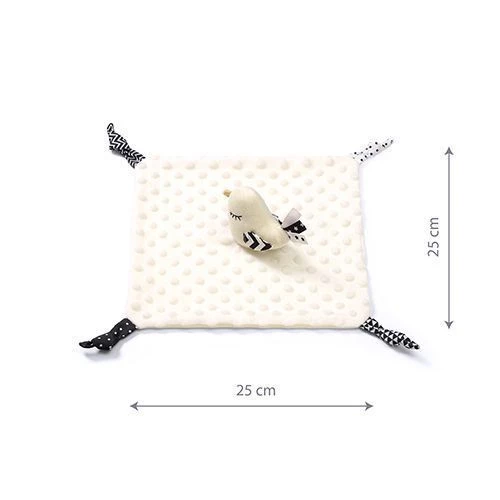 • rozwój – subtelne dźwięki grzechotania pobudzają ciekawość, zachęcają do zabawy i kształtują wyobraźnię dziecka, tasiemki doszyte do kocyka to doskonały sposób na ćwiczenie zręczności